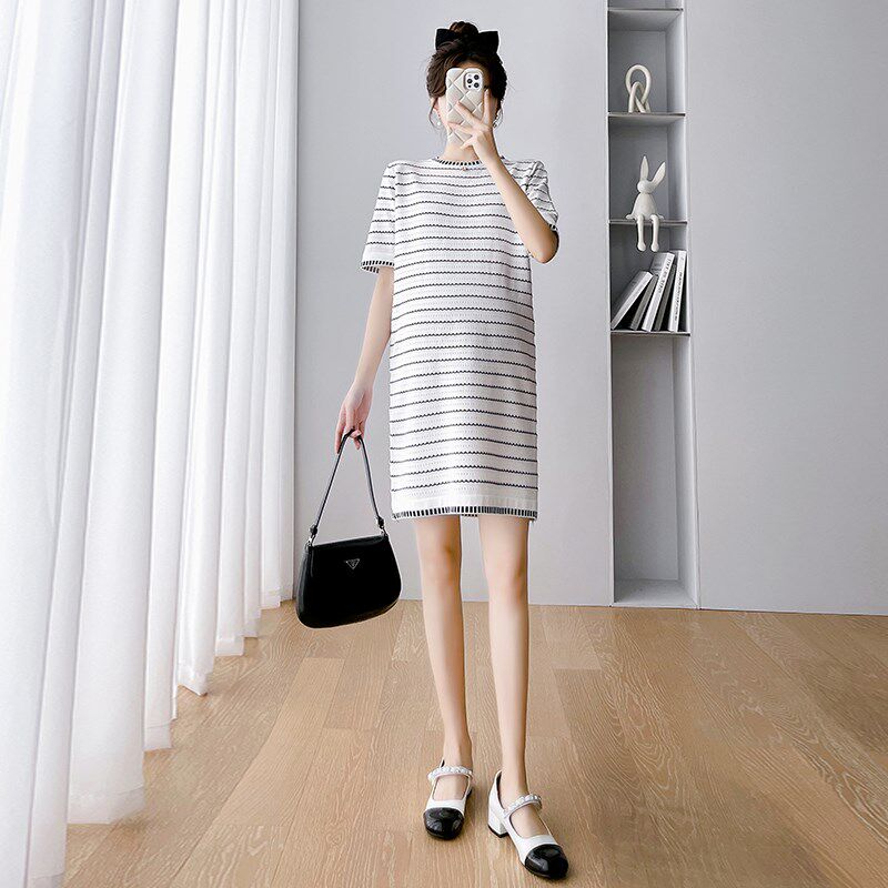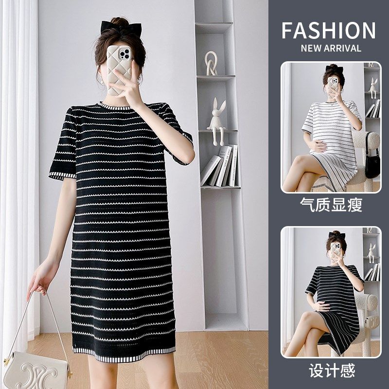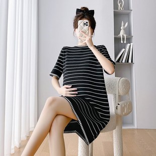 夏装 韩版 短袖 孕妇裙夏季 裙子夏 条纹针织哺乳连衣裙2025新款 孕妇装