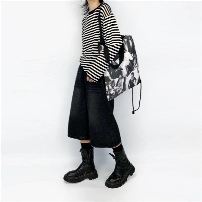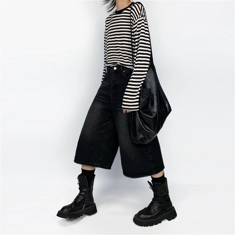 直筒裤 七分牛仔短裤 日系复古黑色水洗宽松阔腿裤 尢系UXI