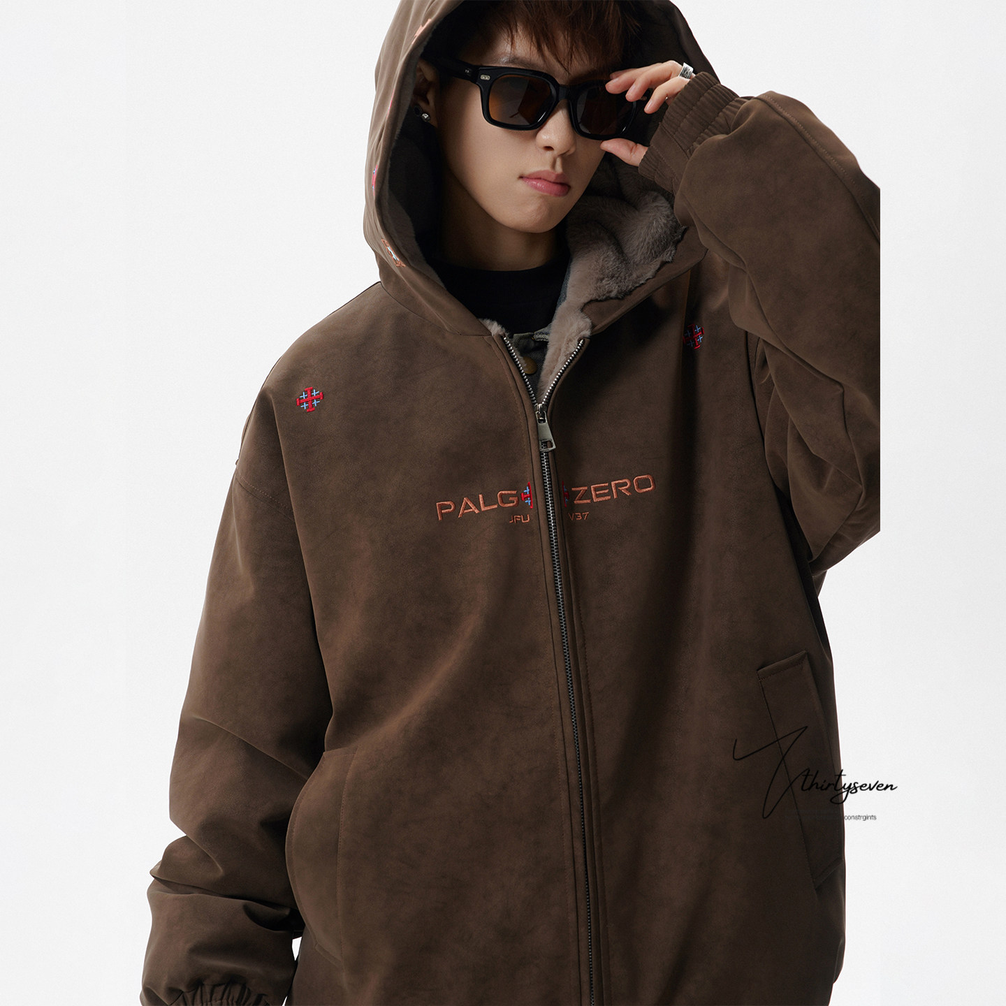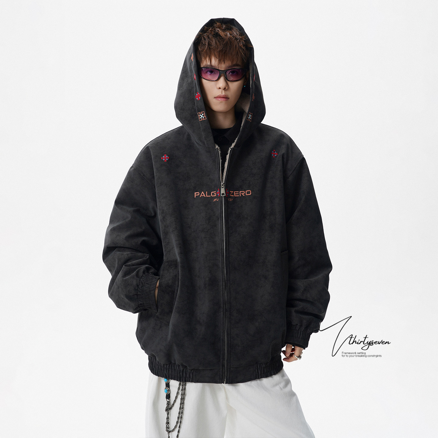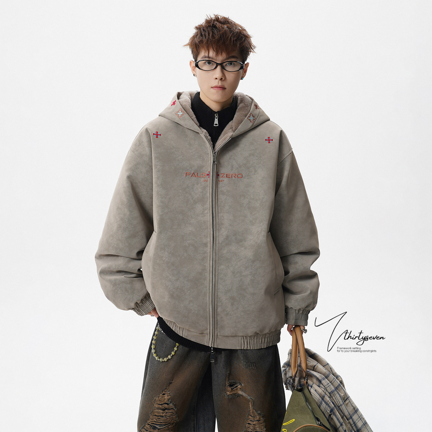 V37美式 小众民族风刺绣宽松休闲棉服上衣 重磅加厚连帽棉衣男冬季
