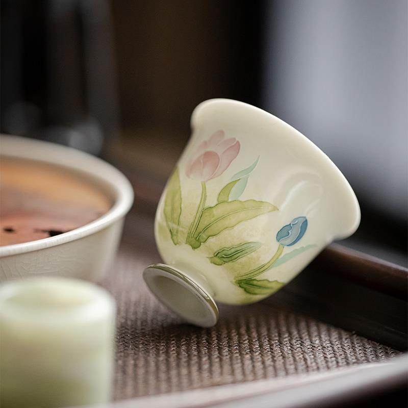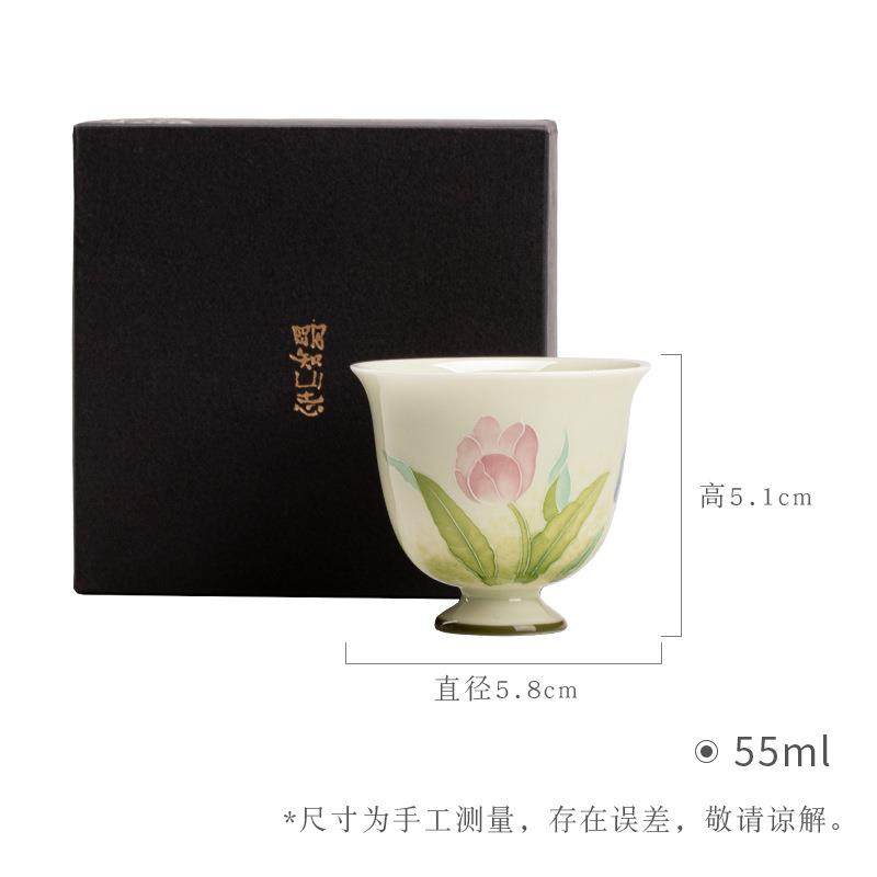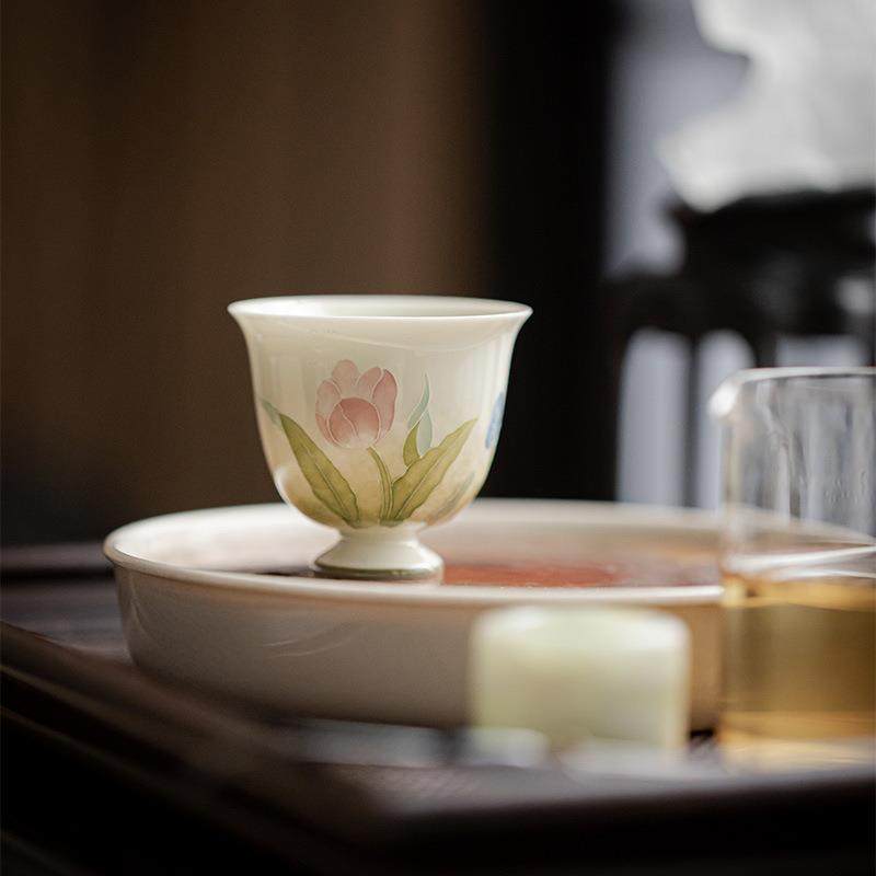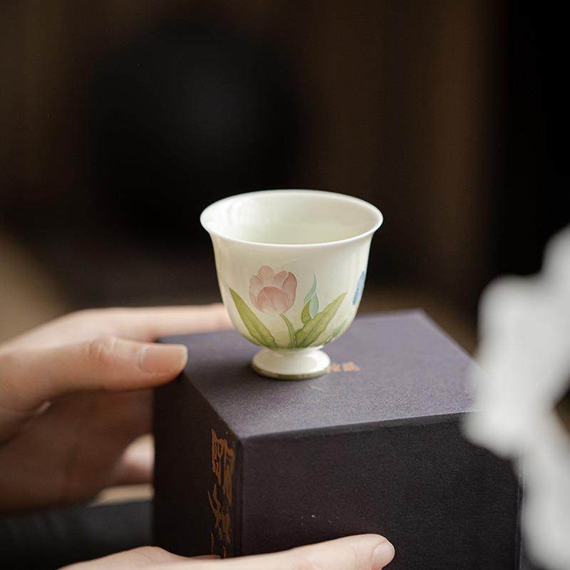 明知山志有田烧郁金香清如茶杯手绘堆料日式 高足品茗杯文人茶杯