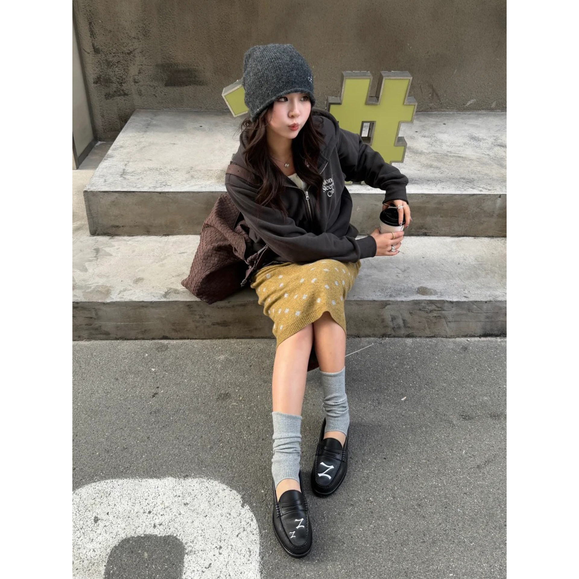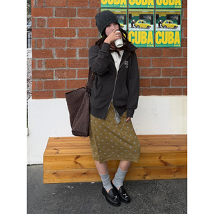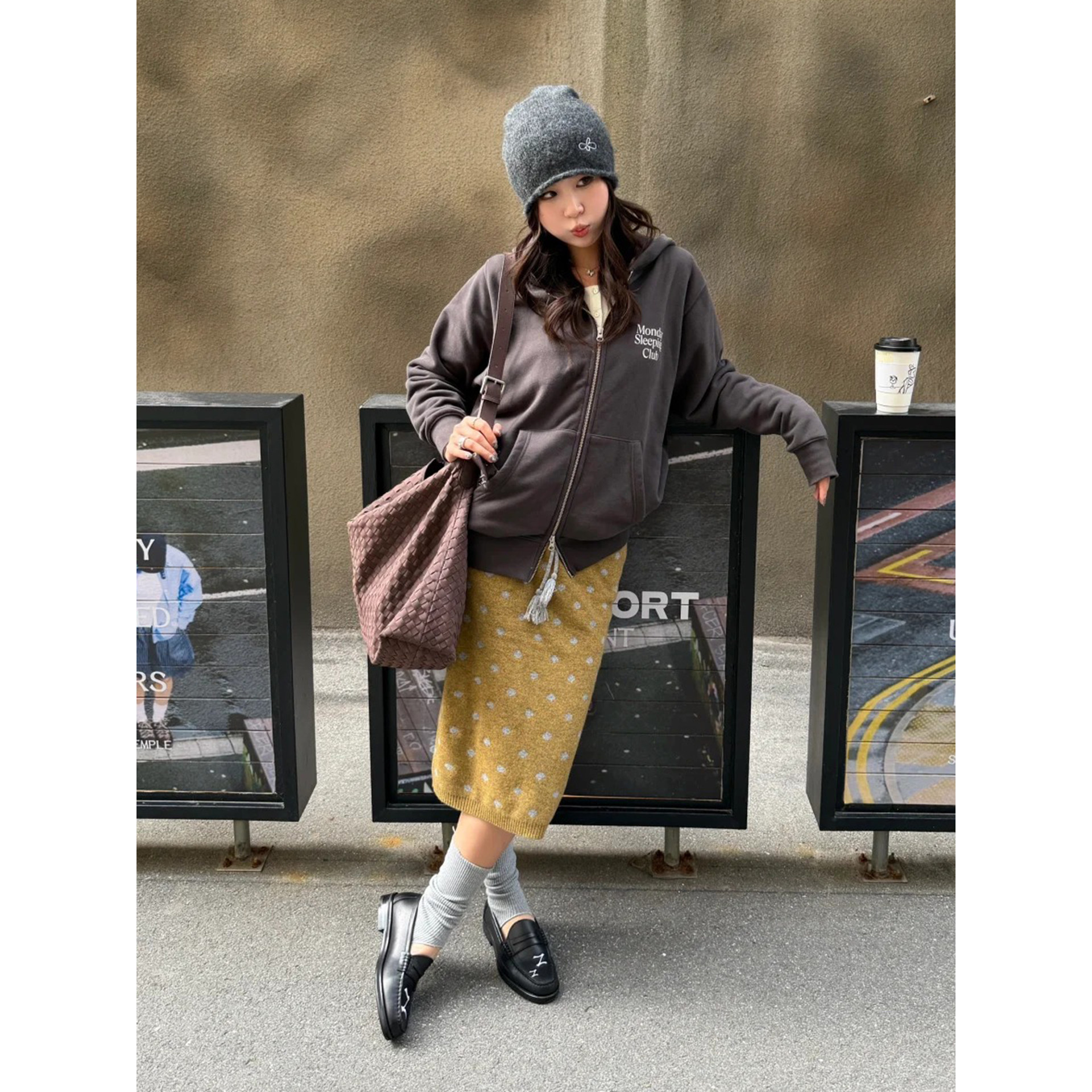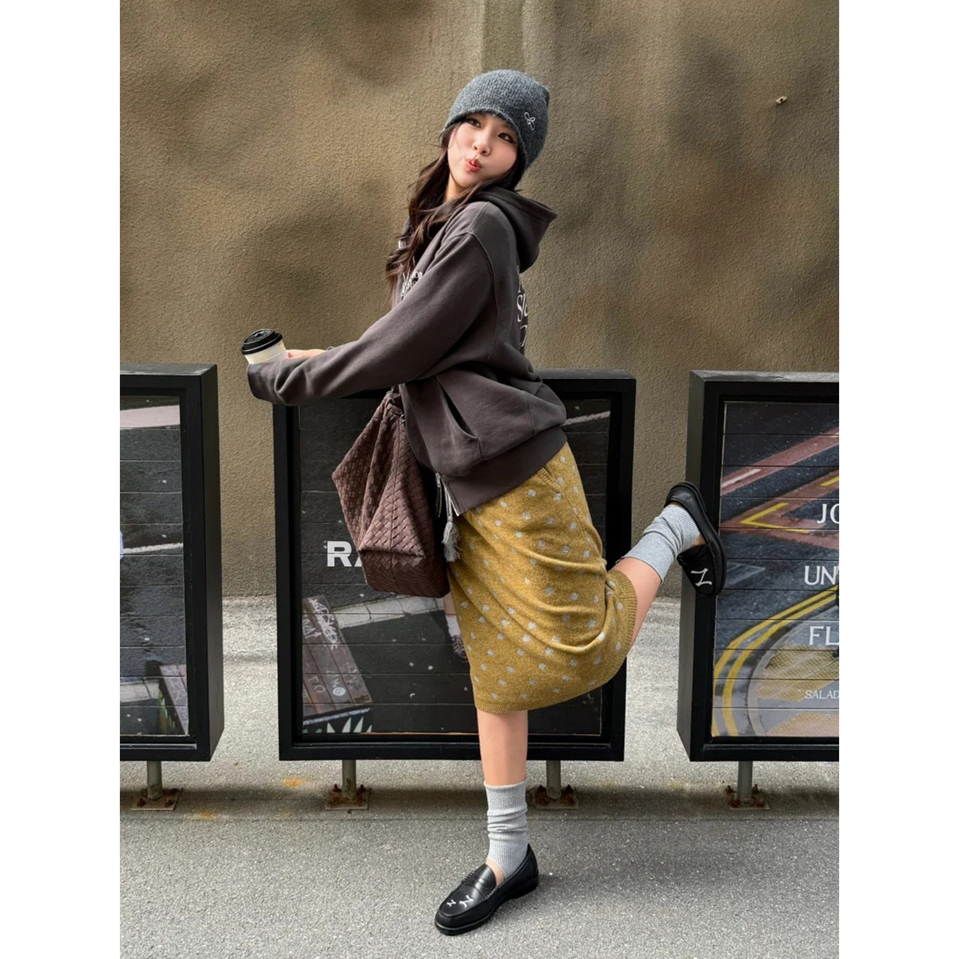 自制日系学院风姜黄色波点毛衣半身裙女秋气质显瘦包臀针织直筒裙