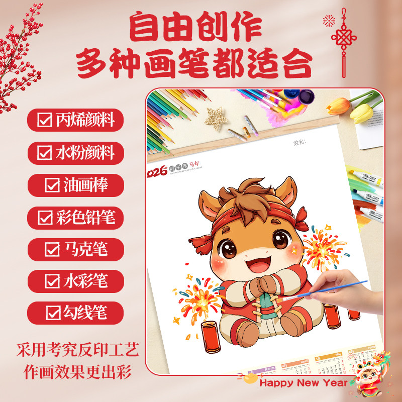 2026马年新款 空白绘画年历卡通diy画画新年日历挂历美术画室材料