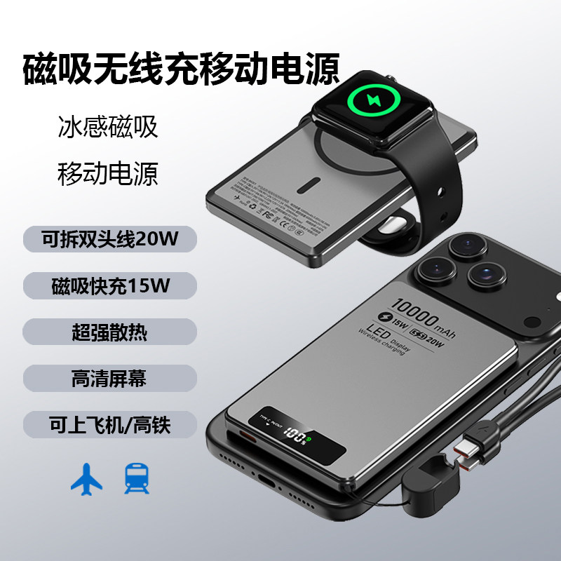 快充超薄适用苹果17pro 磁吸无线充电宝新款 max16手表外接电池三合一移动电源 3C认证充电宝可上飞机