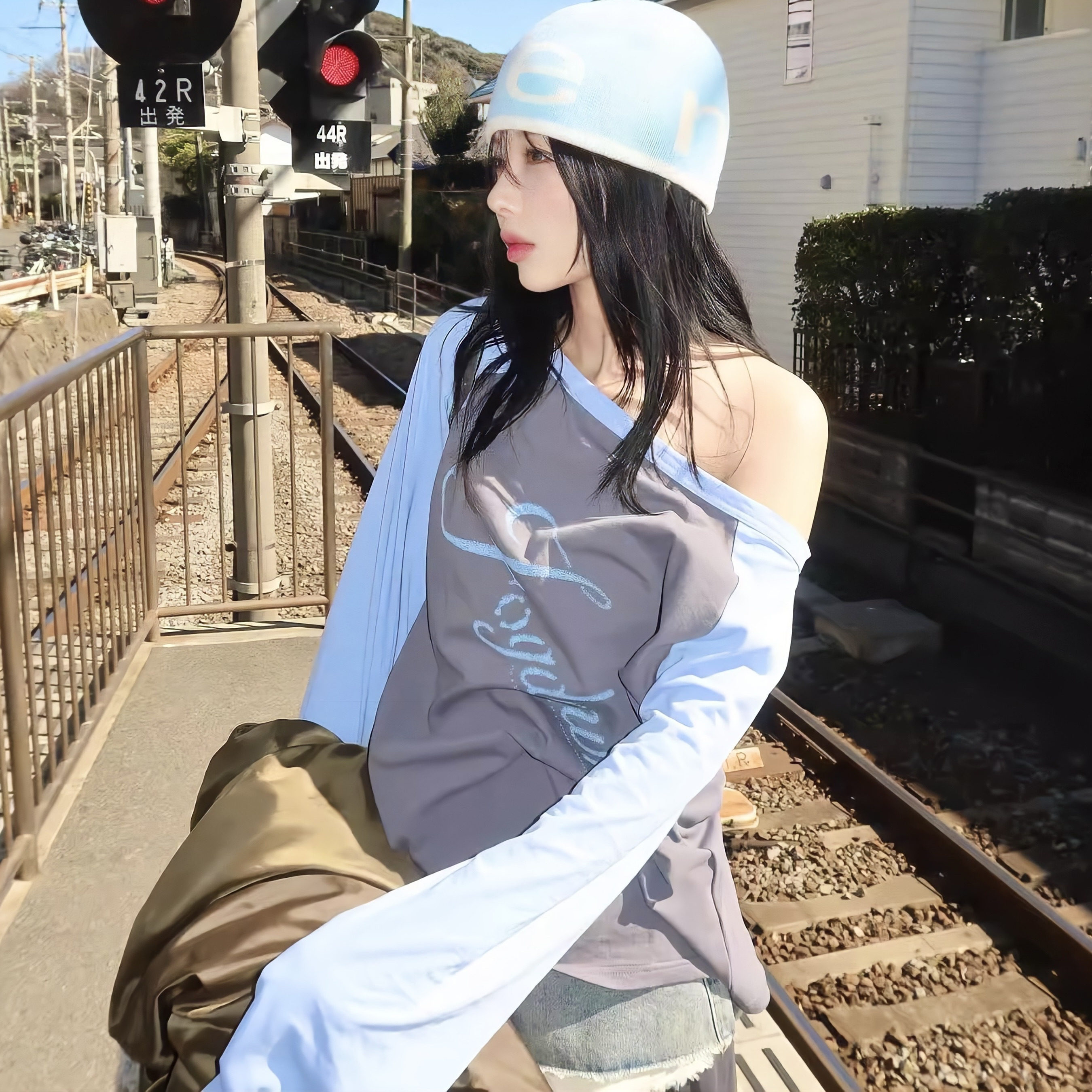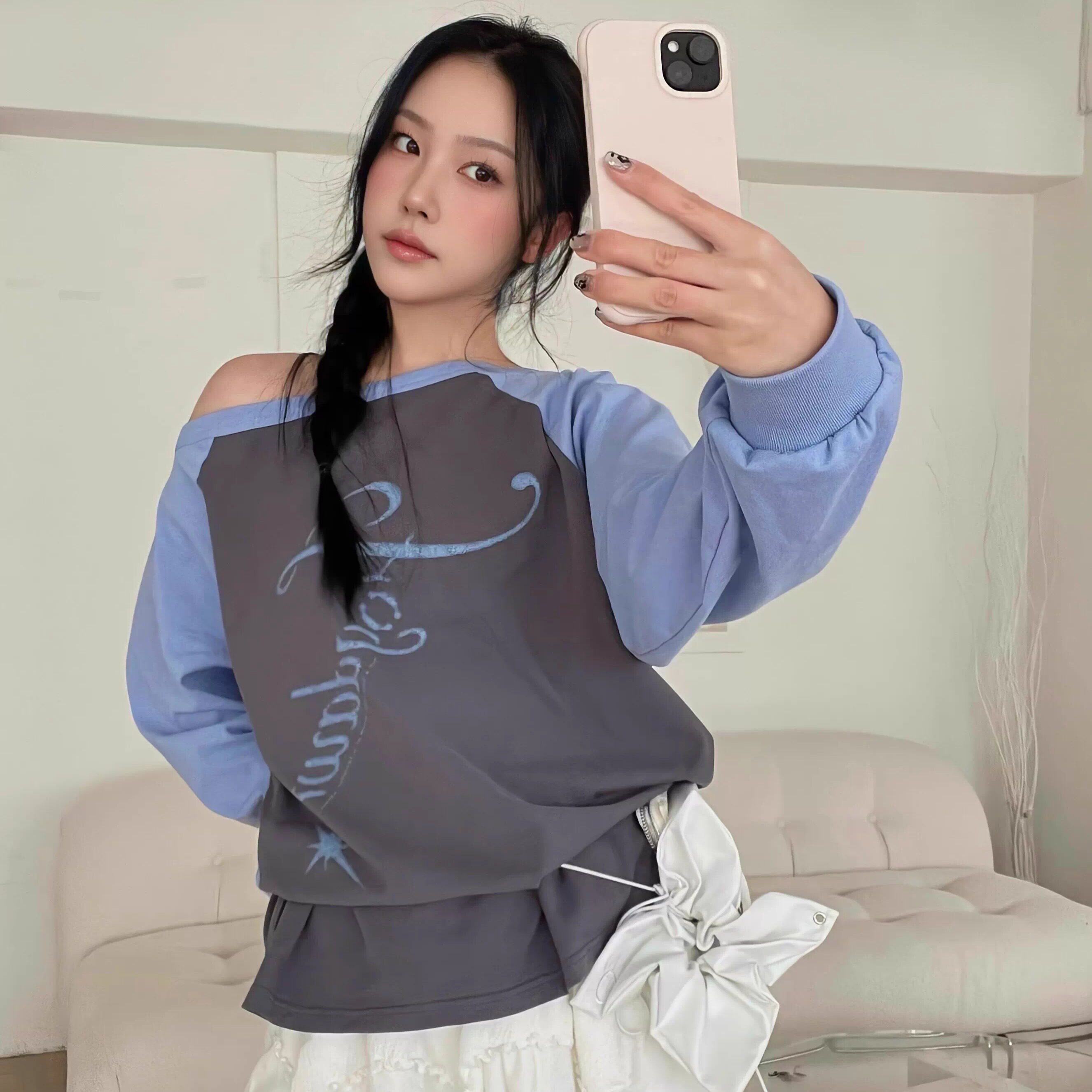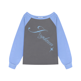 复古撞色灰蓝色星光字母露肩长袖 minju朴敏珠同款 T恤 Stu REOY