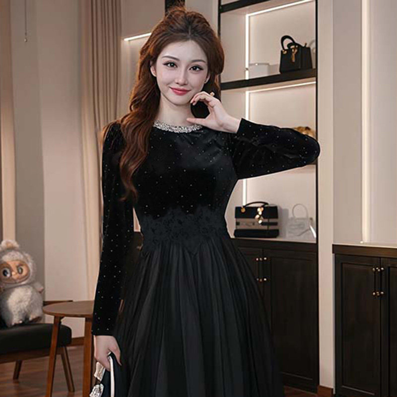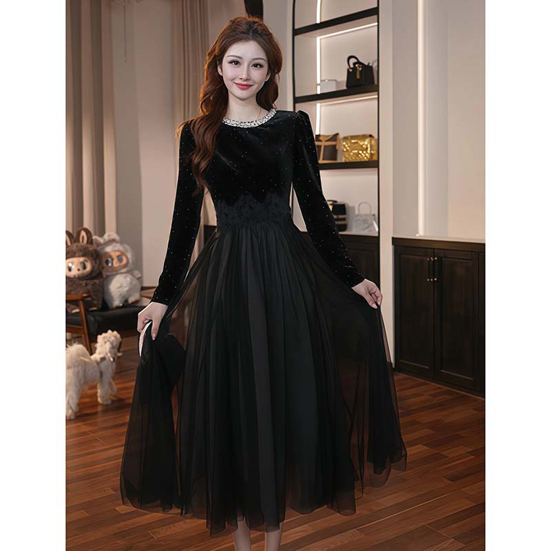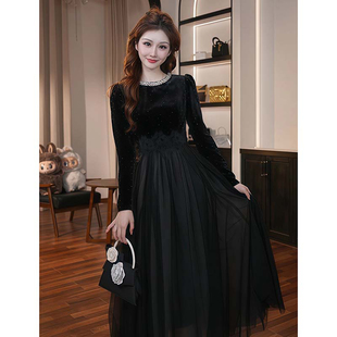 时尚 加绒有里布减龄中长款 感高腰宽松网纱裙LJ0130 新款 2025秋冬季