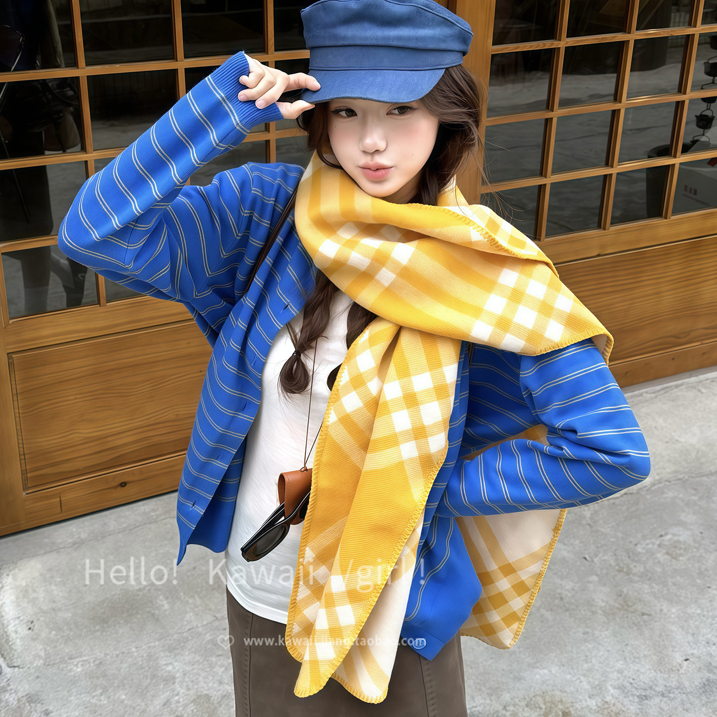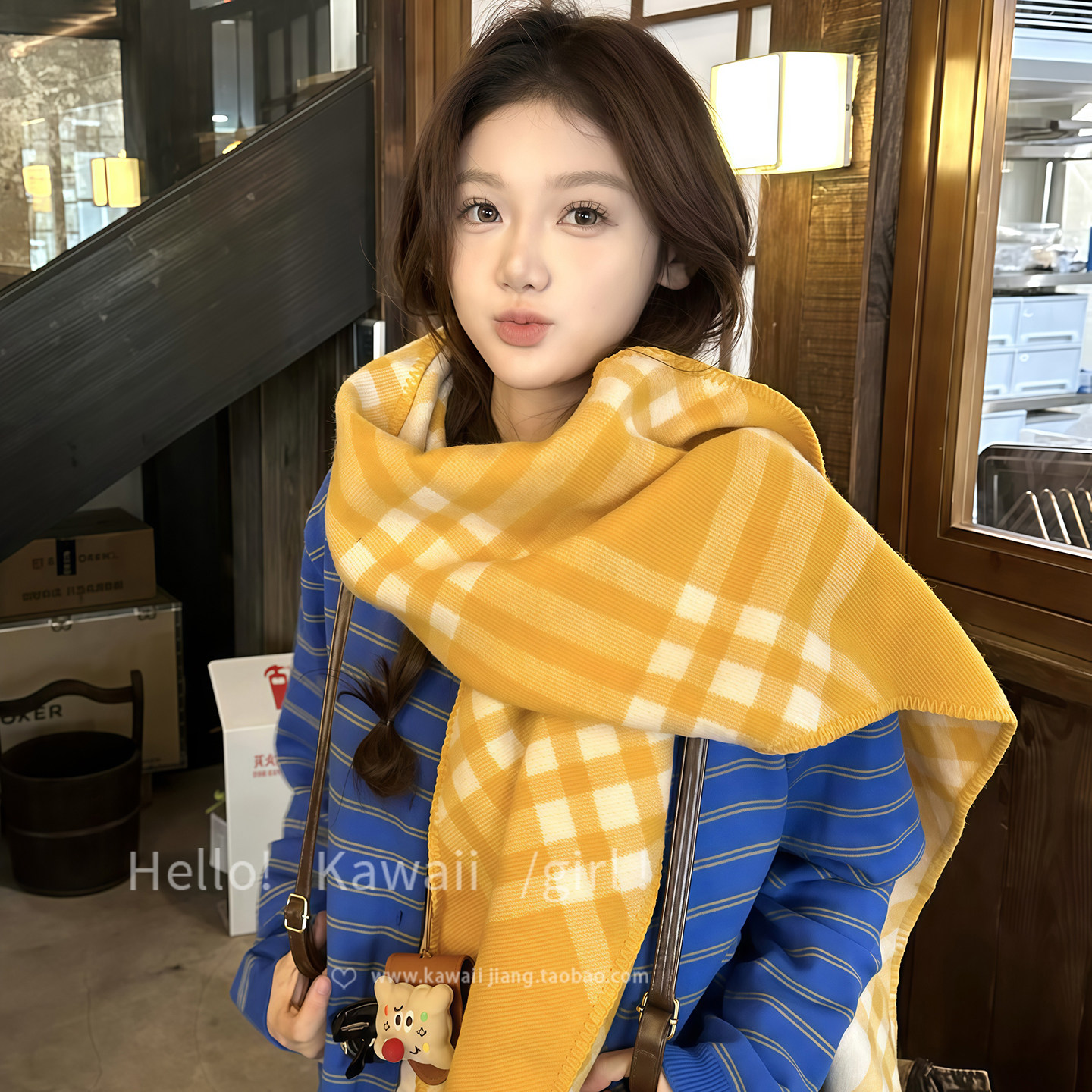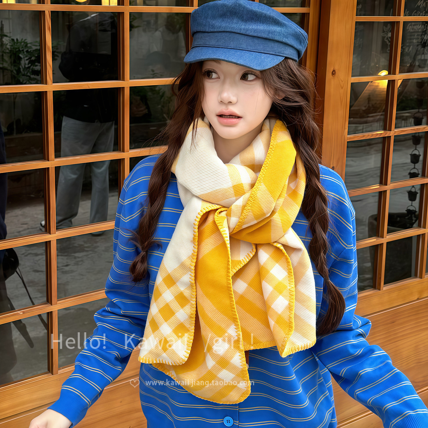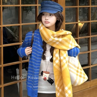 秋冬韩系明媚温柔黄色格纹围巾文艺复古百搭气质披肩加厚保暖围脖
