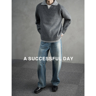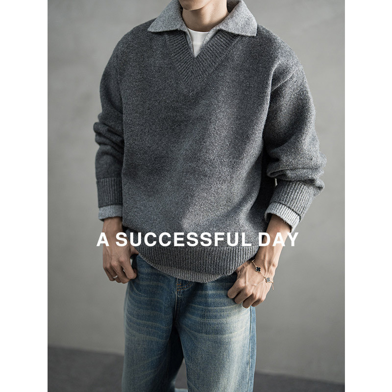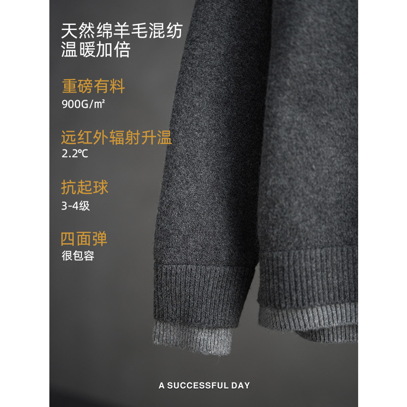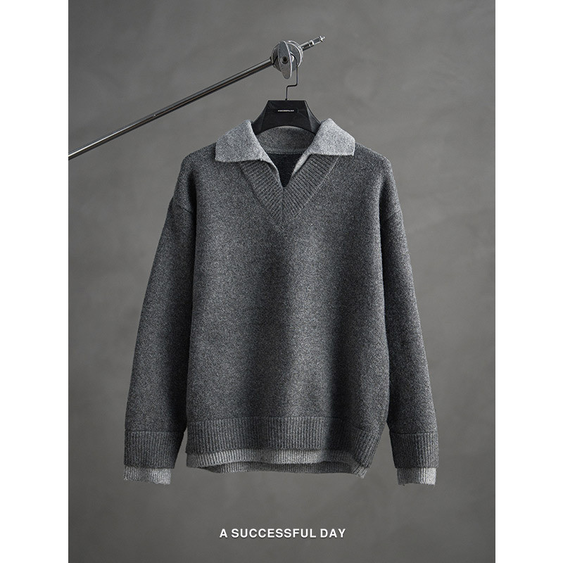 ASSDY 绵羊毛900G重磅翻领假两件毛衣男2025冬轻熟风休闲针织线衣
