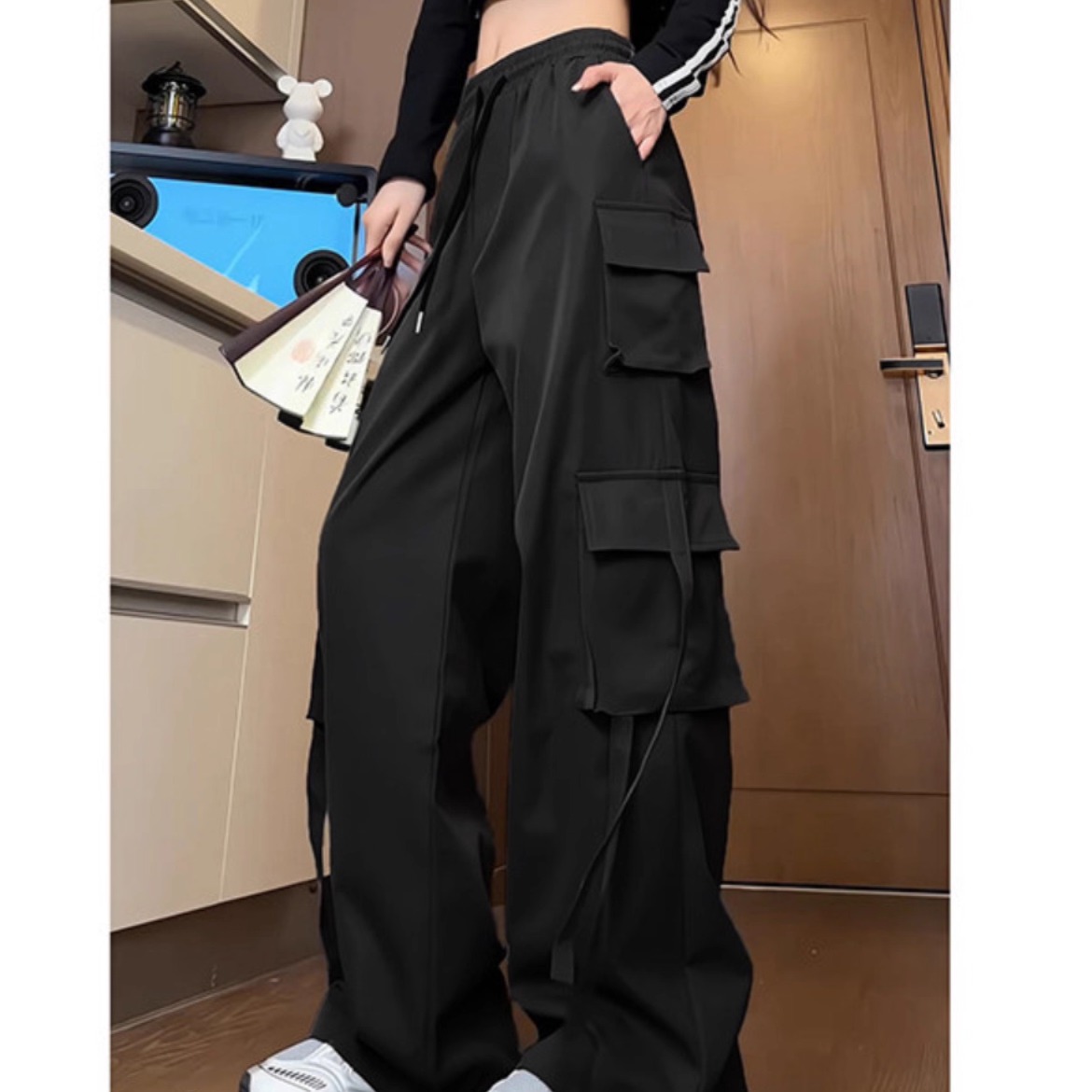 女款 裤 秋季 美式 薄 高街飘带直筒宽松阔腿长裤 加绒蓝色多口袋工装