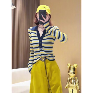 长袖 美式 修身 女内搭设计感秋冬季 正肩上衣 复古撞色条纹针织打底衫