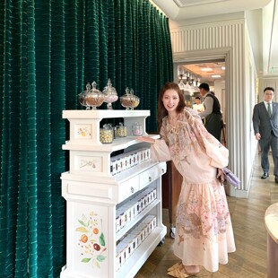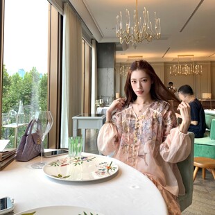 印花半身裙气质休闲套装 衬衫 浮生繁花粉色抽绳灯笼袖 SourceWithU