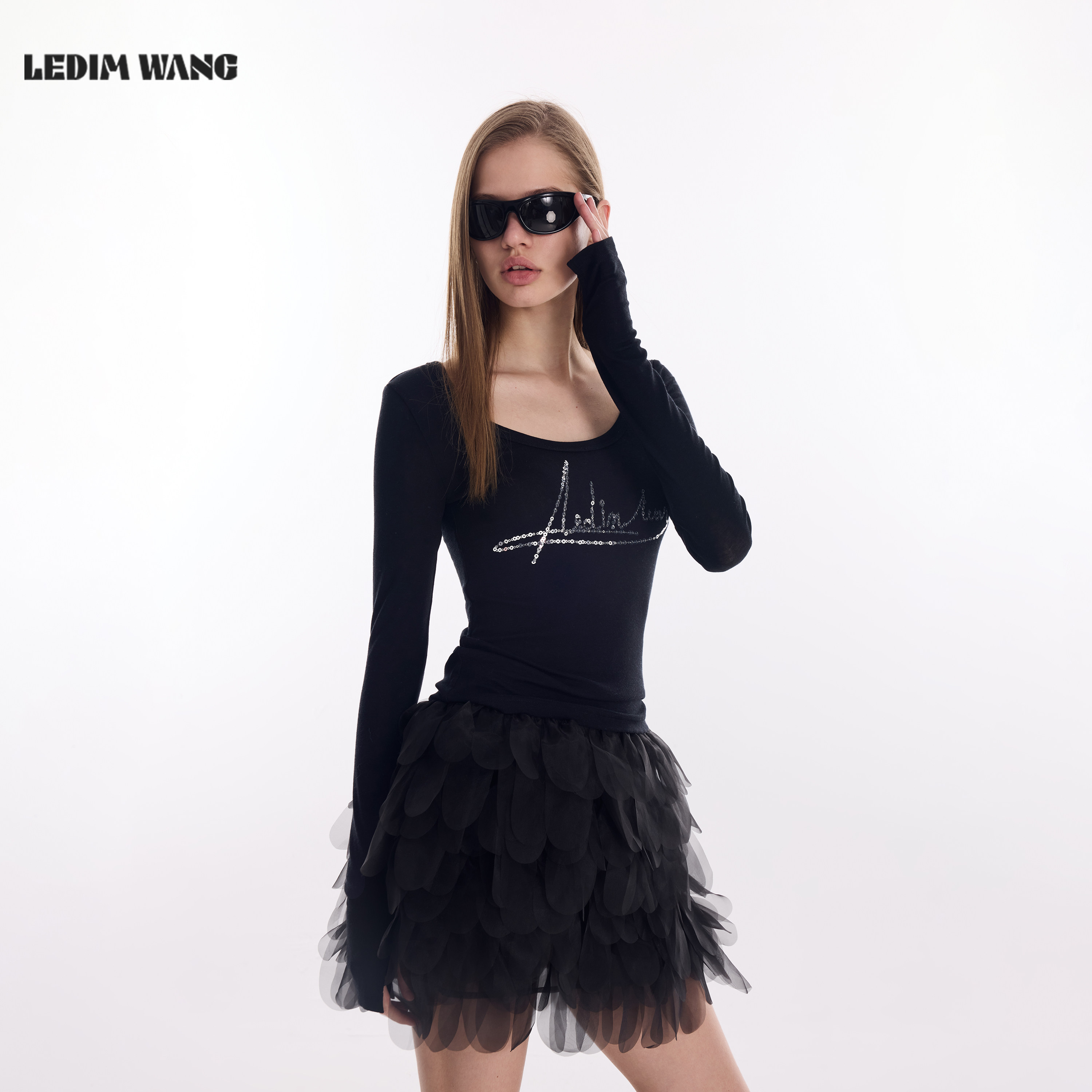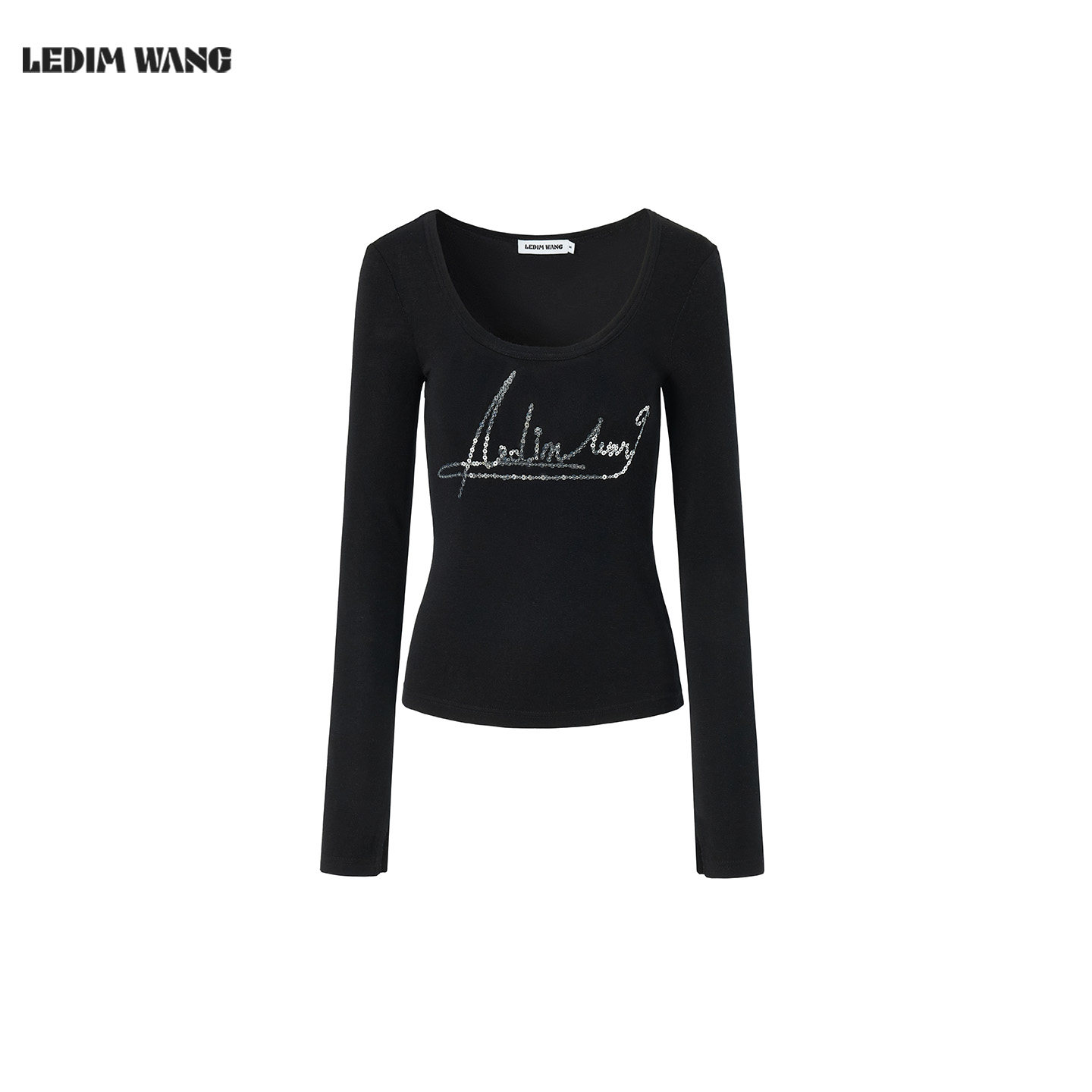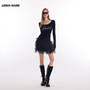 黑色莱赛尔羊毛修身 LEDIM 女2026春新款 毛针织衫 上衣 WANGU领长袖