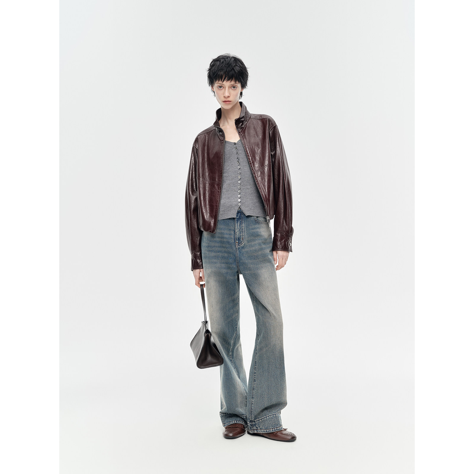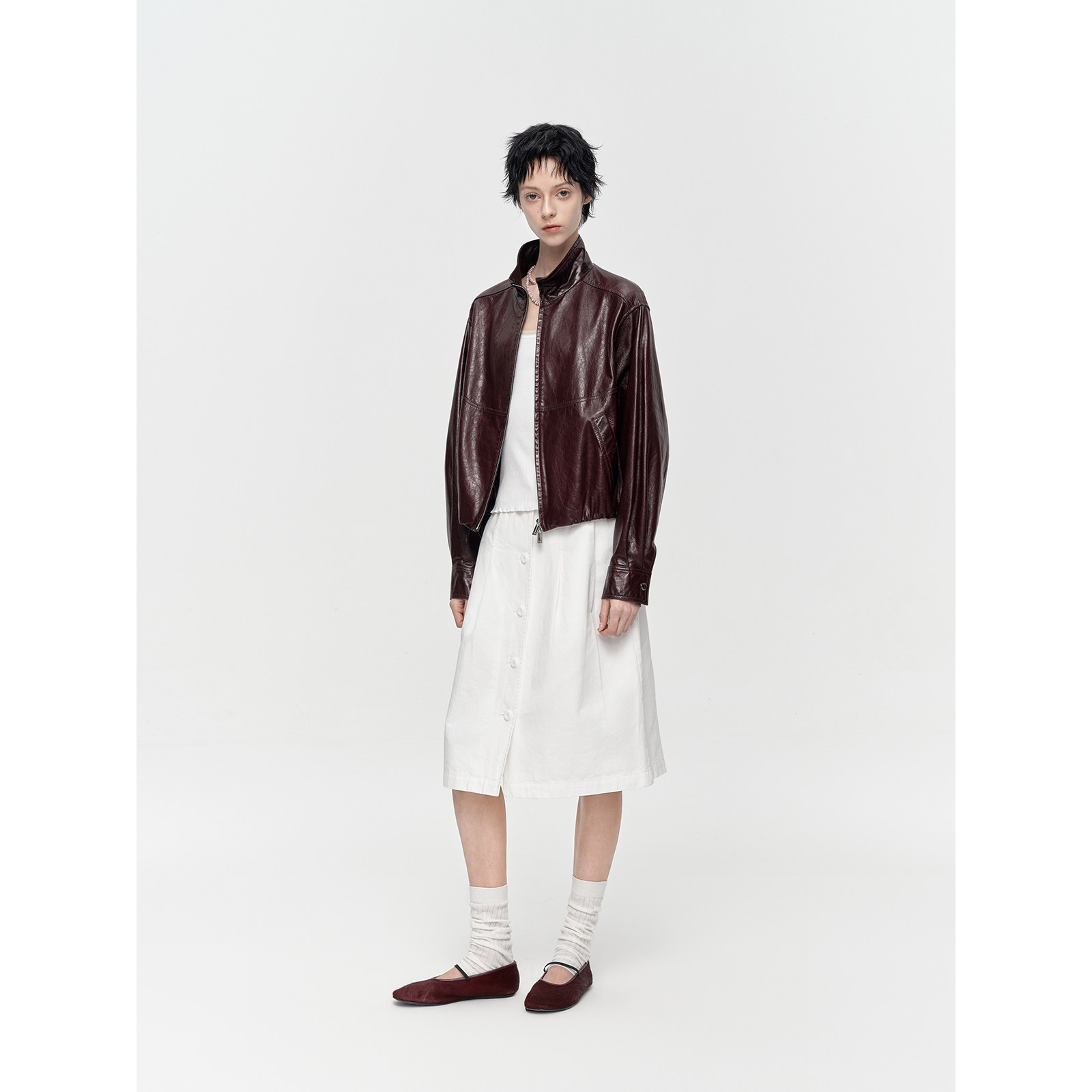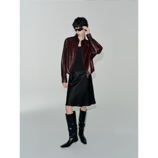 夹克皮衣女春季 油蜡羊皮立领抽褶设计短款 外套 勃艮第 华吉言