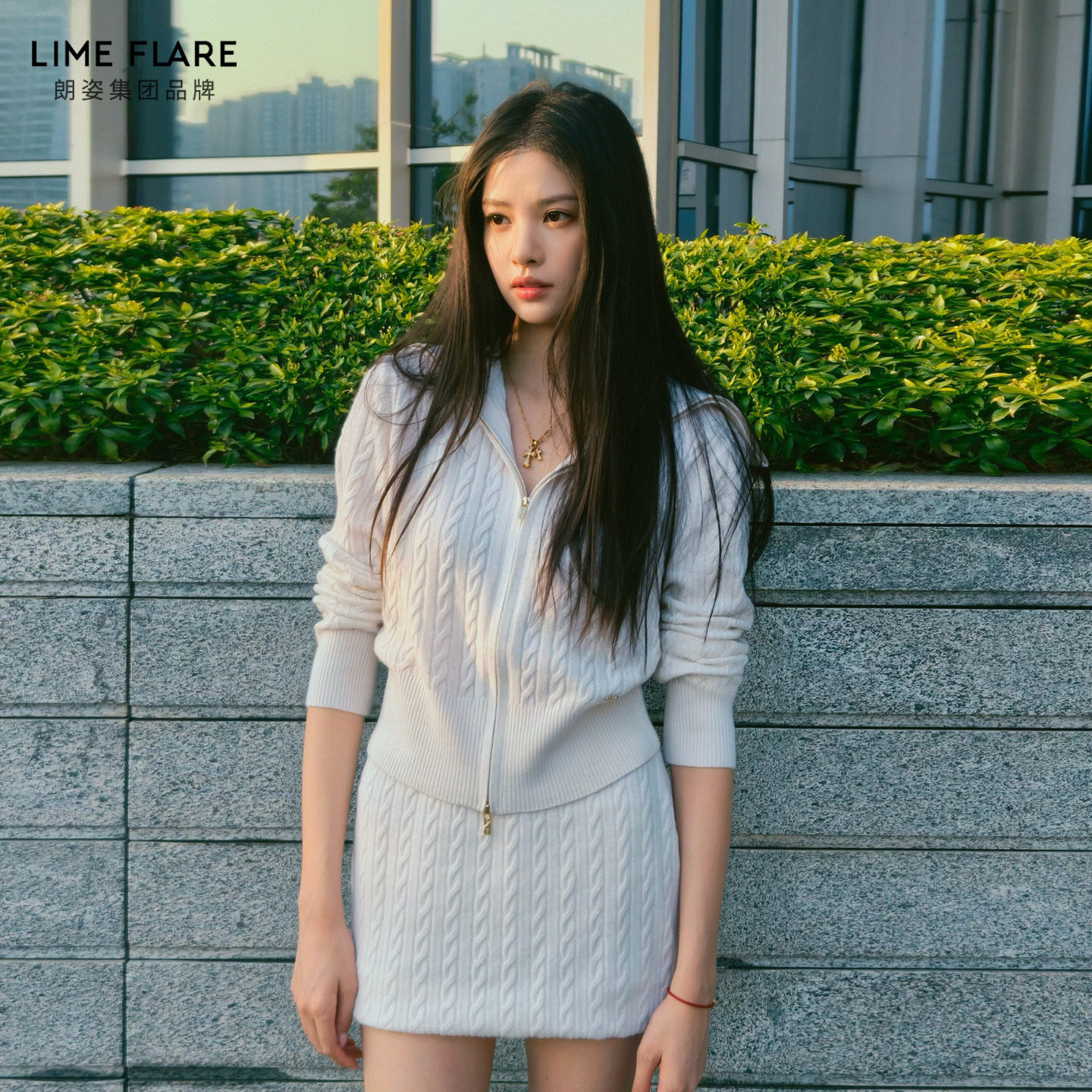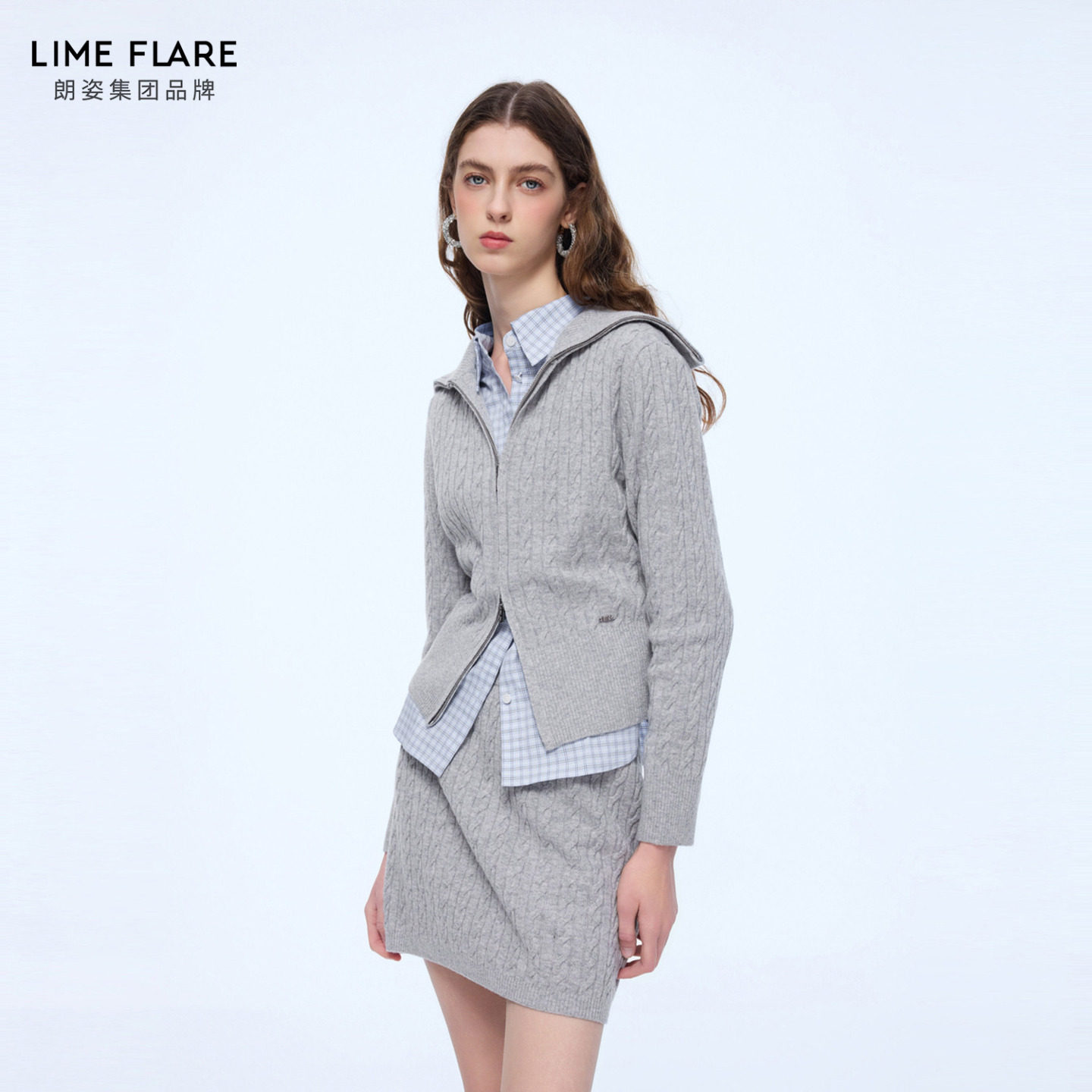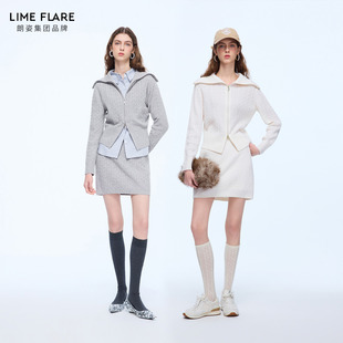 裙翻领上衣半身裙 套装 朗姿莱茵福莱尔高智感羊毛绞花针织开衫 修身