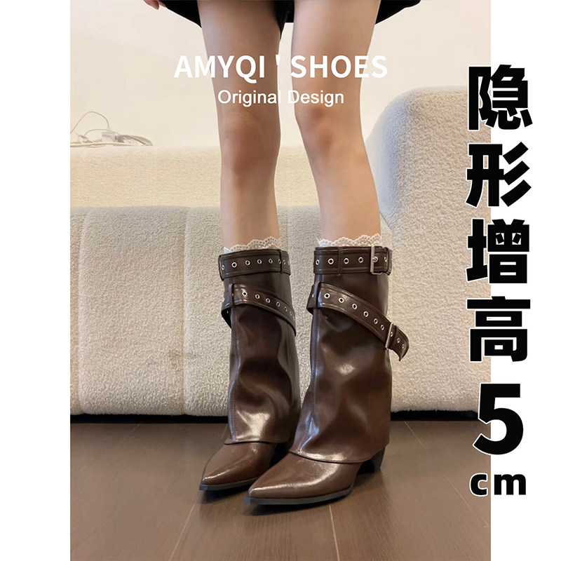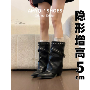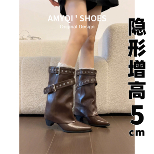 真皮内增高美拉德粗跟裤 加绒显瘦增高骑士中筒短靴 管靴女2026新款