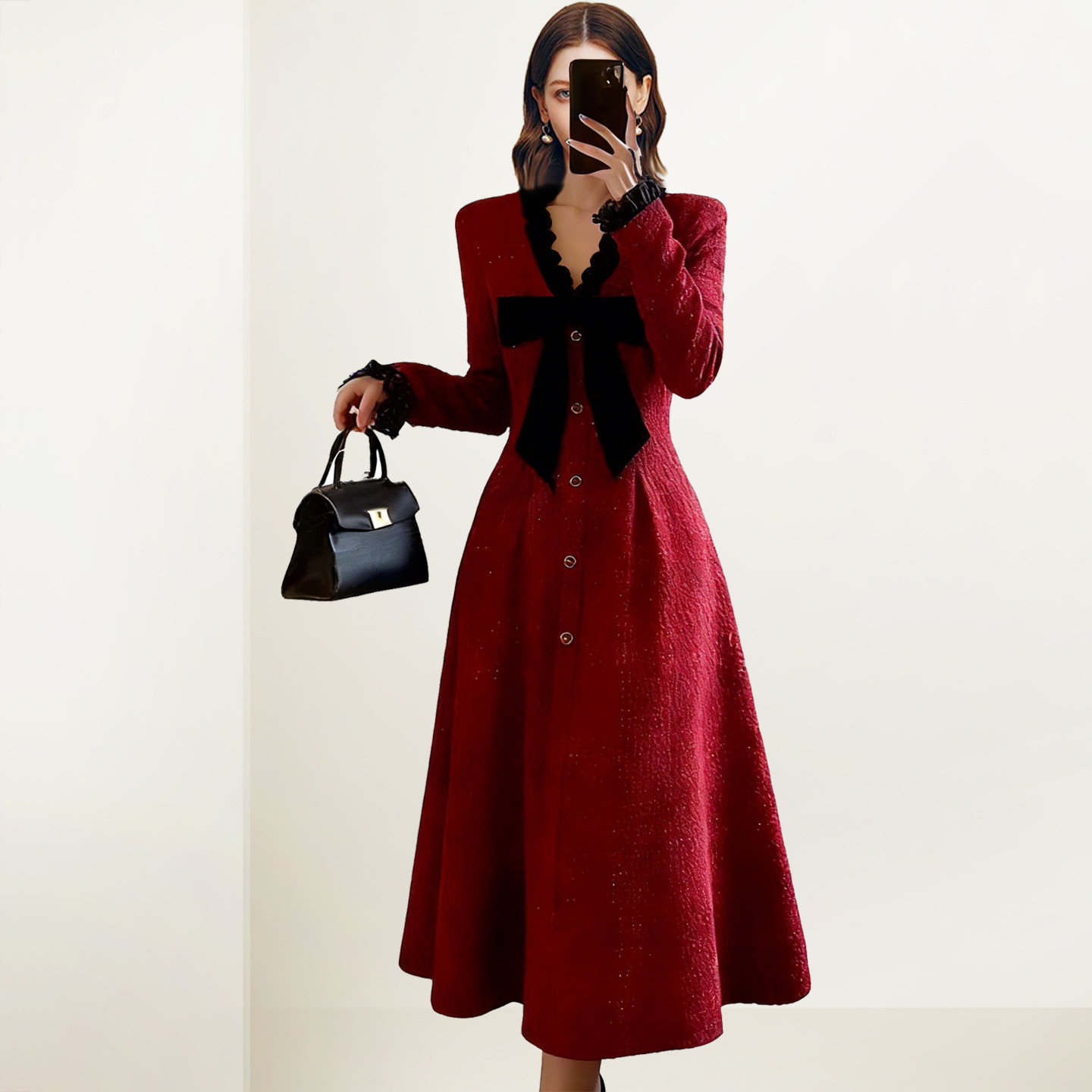 法式 新款 蝴蝶结打底内搭A字裙 2026春季 QOOEL小香风V领收腰连衣袖