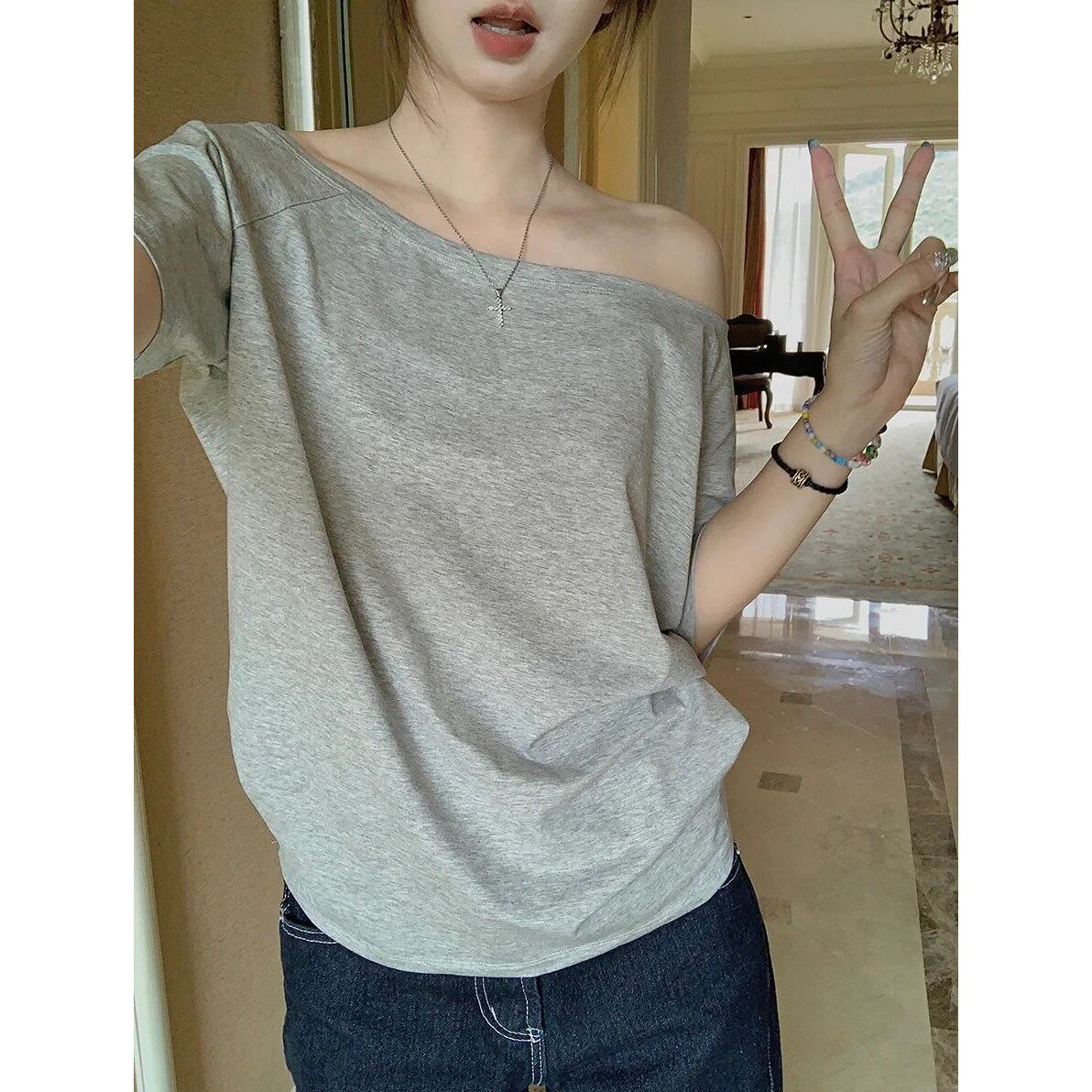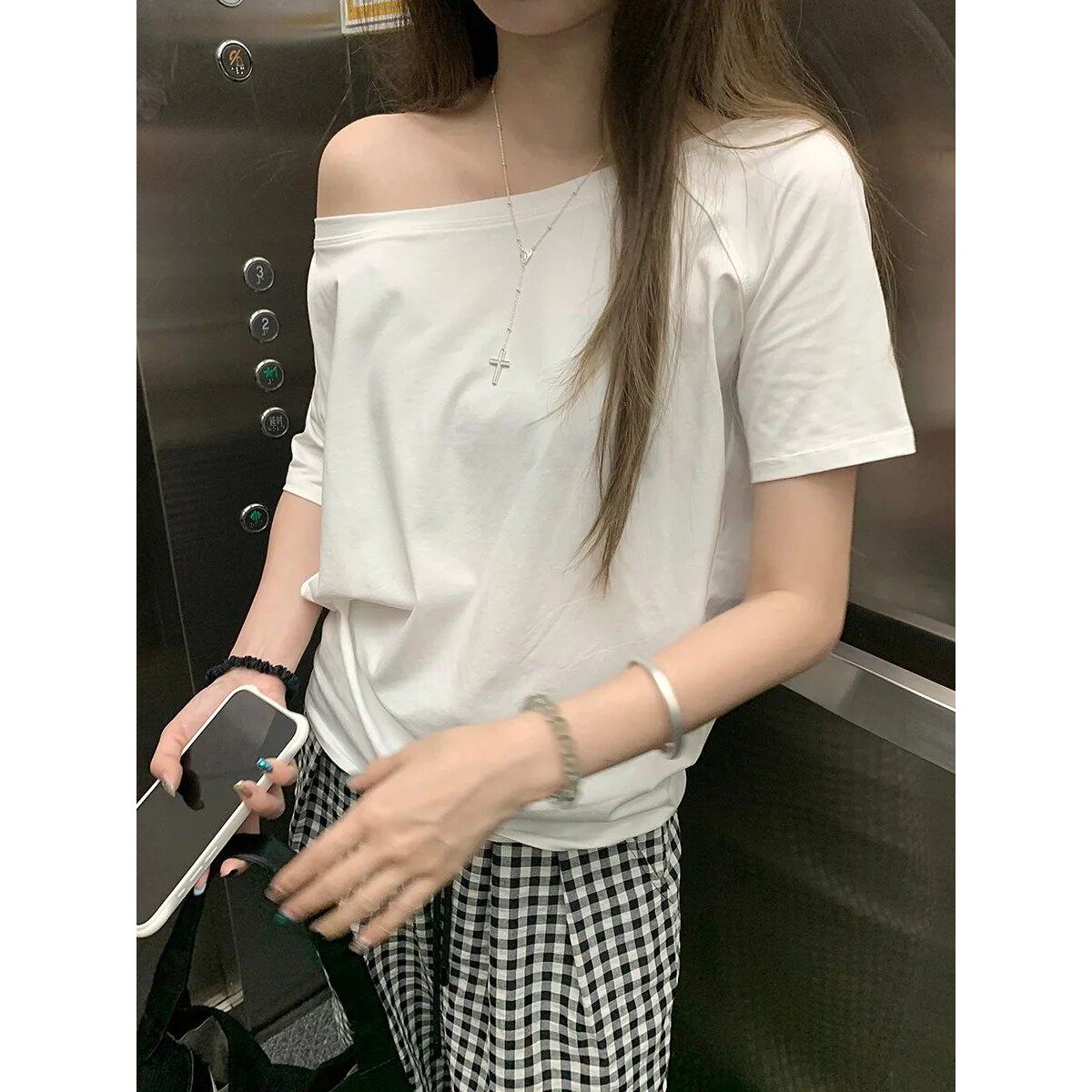 T恤女Summer Tee White Shoulder Top Off 斜肩露肩宽松遮肉短袖