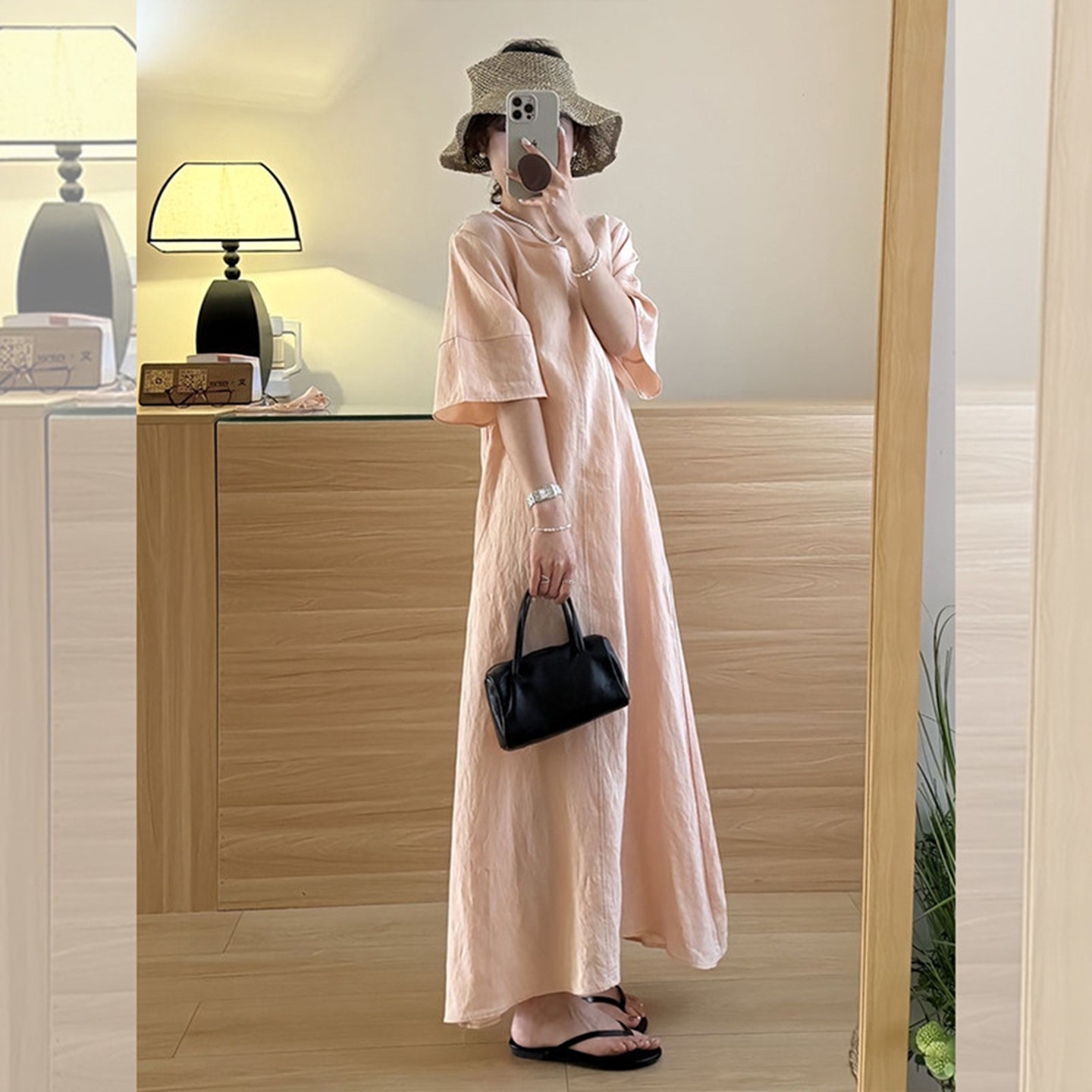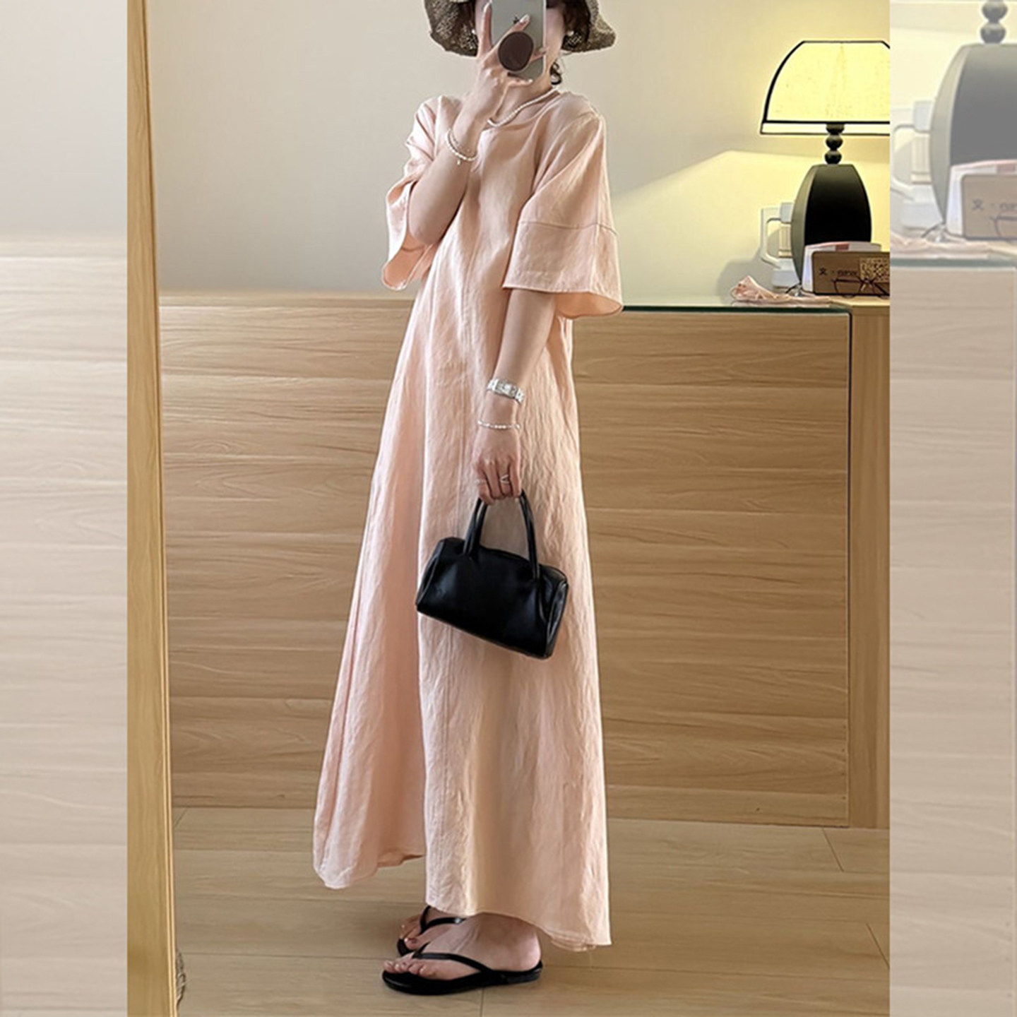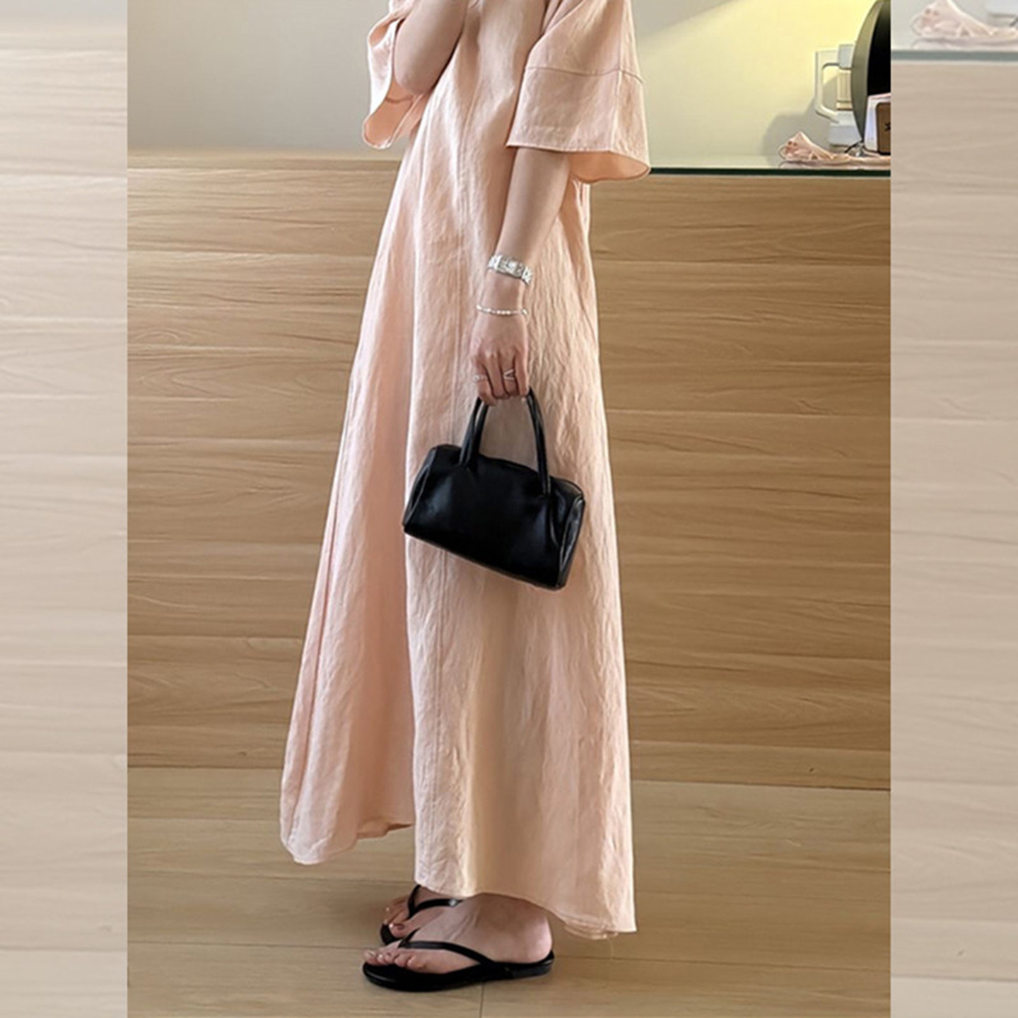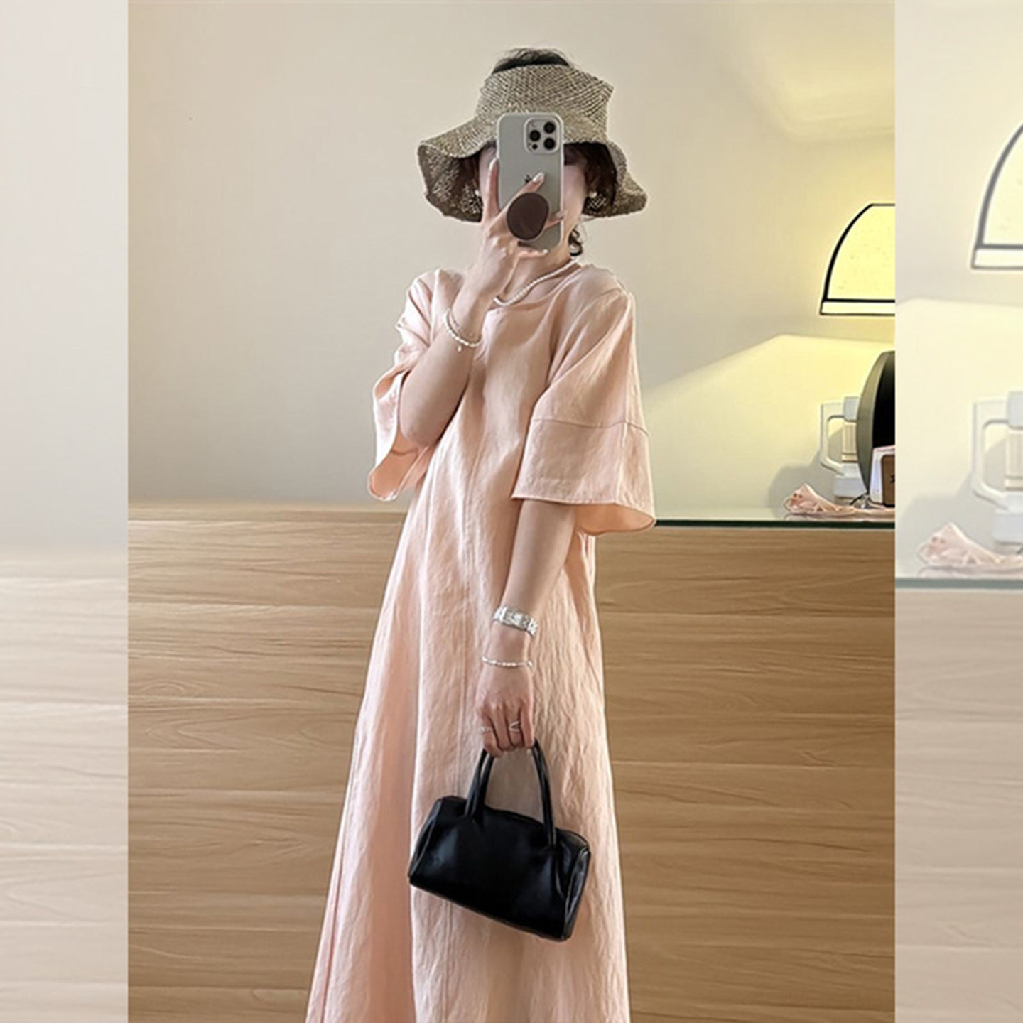 绝美粉色连衣裙女温柔风独特圆领宽松短袖 法式 长裙子 新款 2026夏季