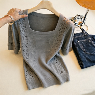 超好看爆款 胖MM复古chic洋气方领短袖 新款 女夏季 显瘦上衣 针织衫