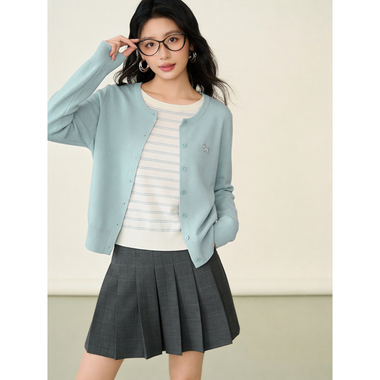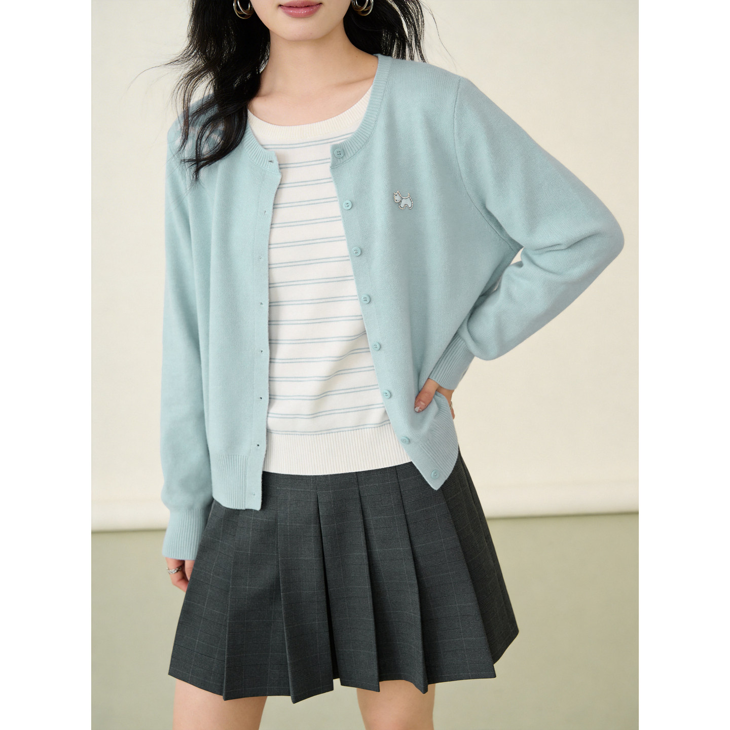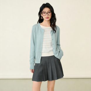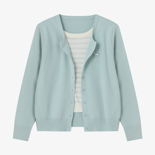 女温柔风宽松长袖 百家好假两件条纹拼接针织开衫 上衣 House Basic