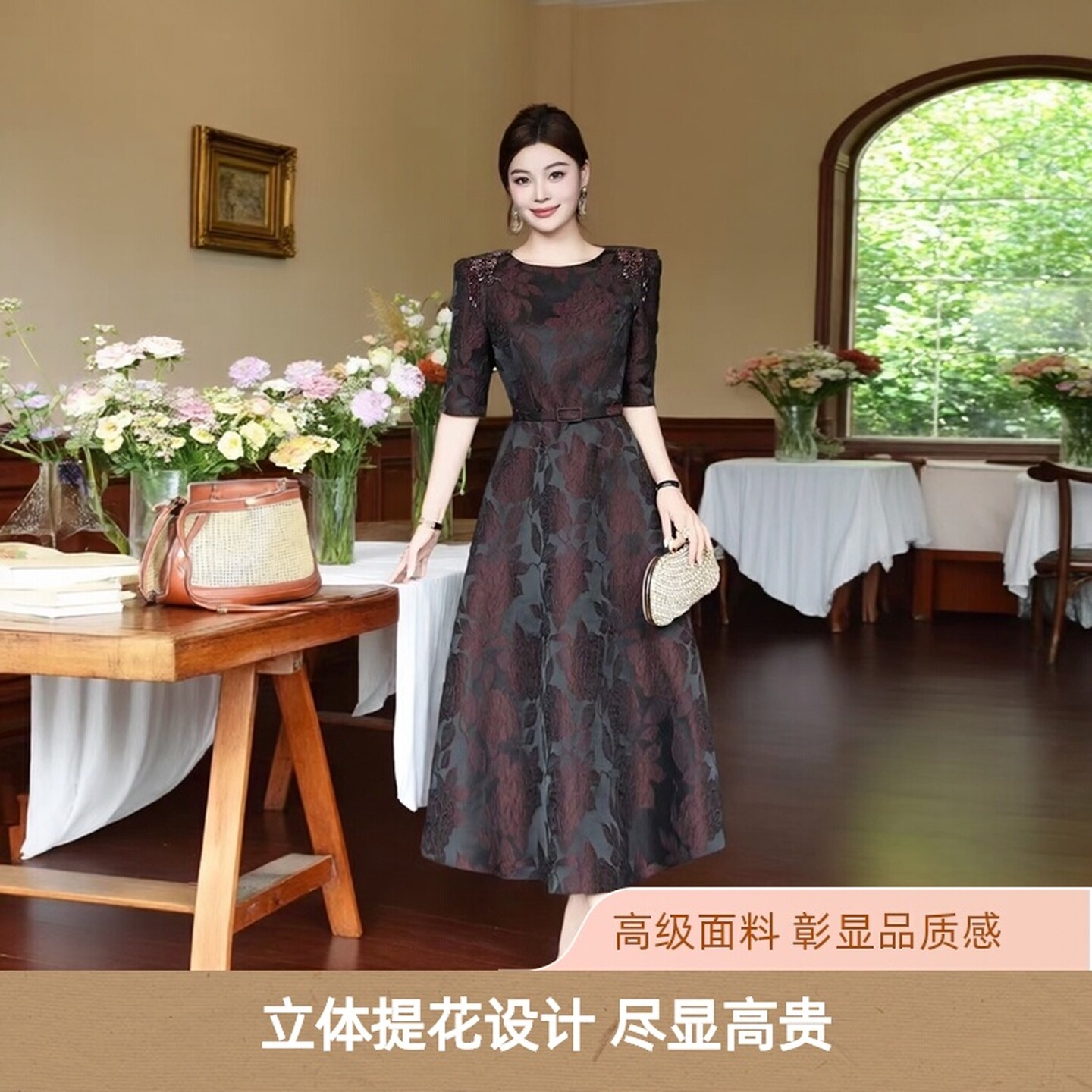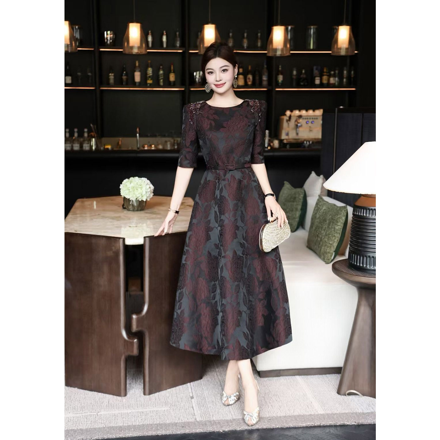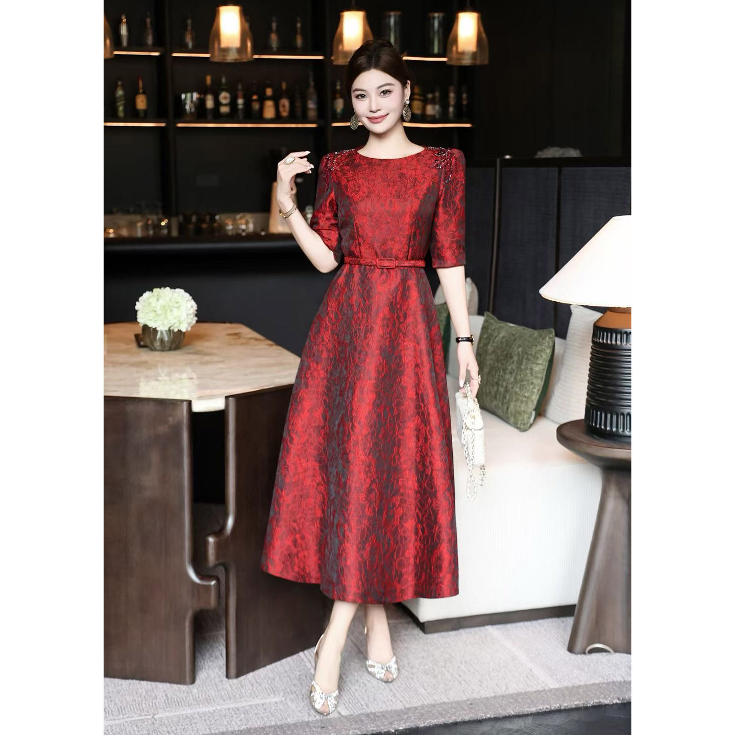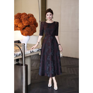 洋气酒红色高级立体提花订钻奢华气质女装 连衣裙喜妈妈优雅礼服裙