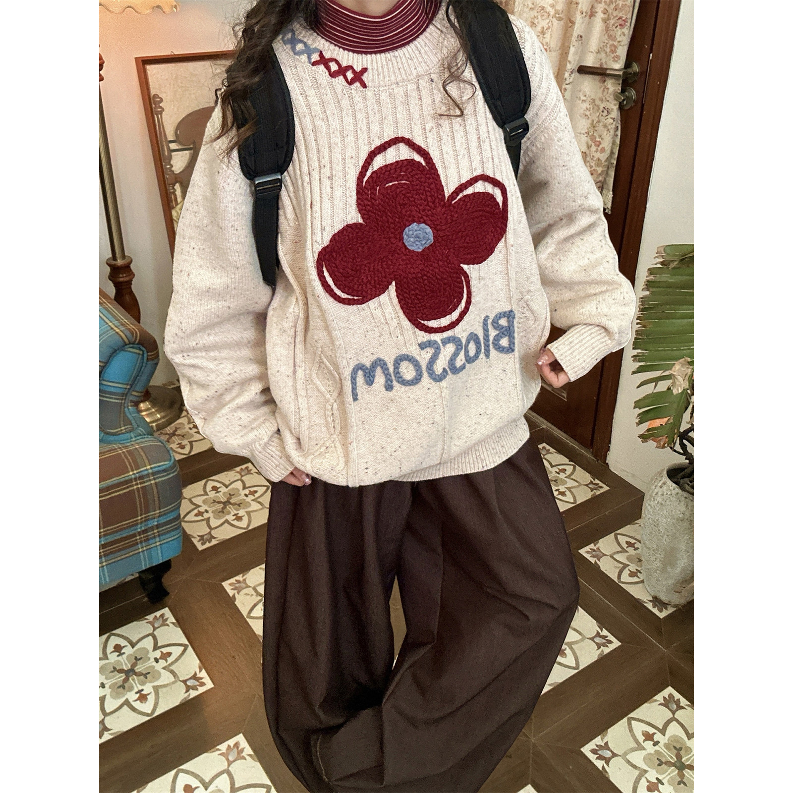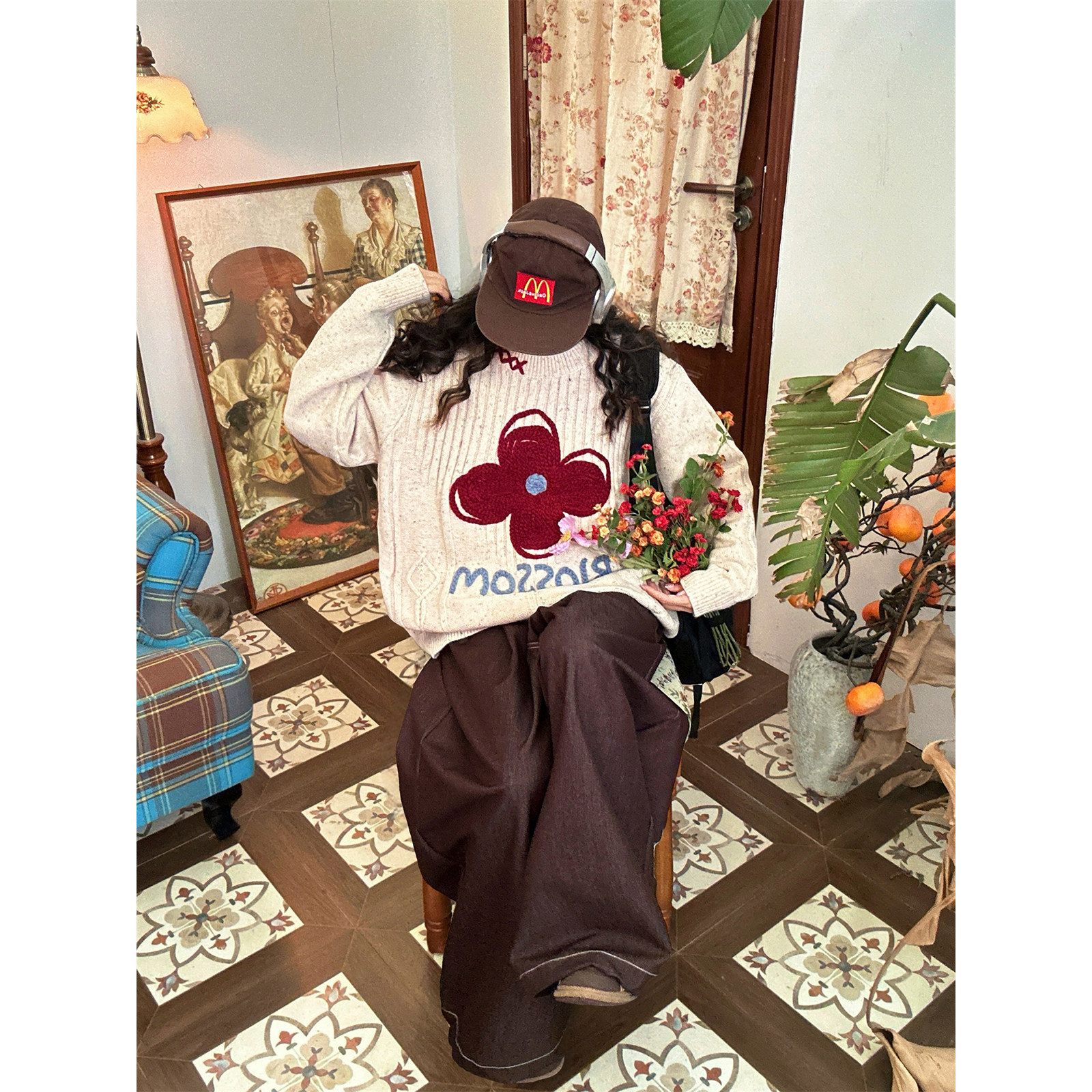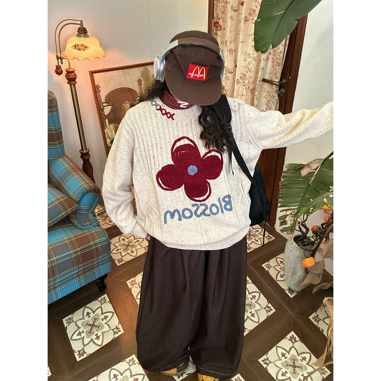 男女同款 日系立体钩织花朵圆领套头毛衣针织衫 上衣 秋冬款 C2自制