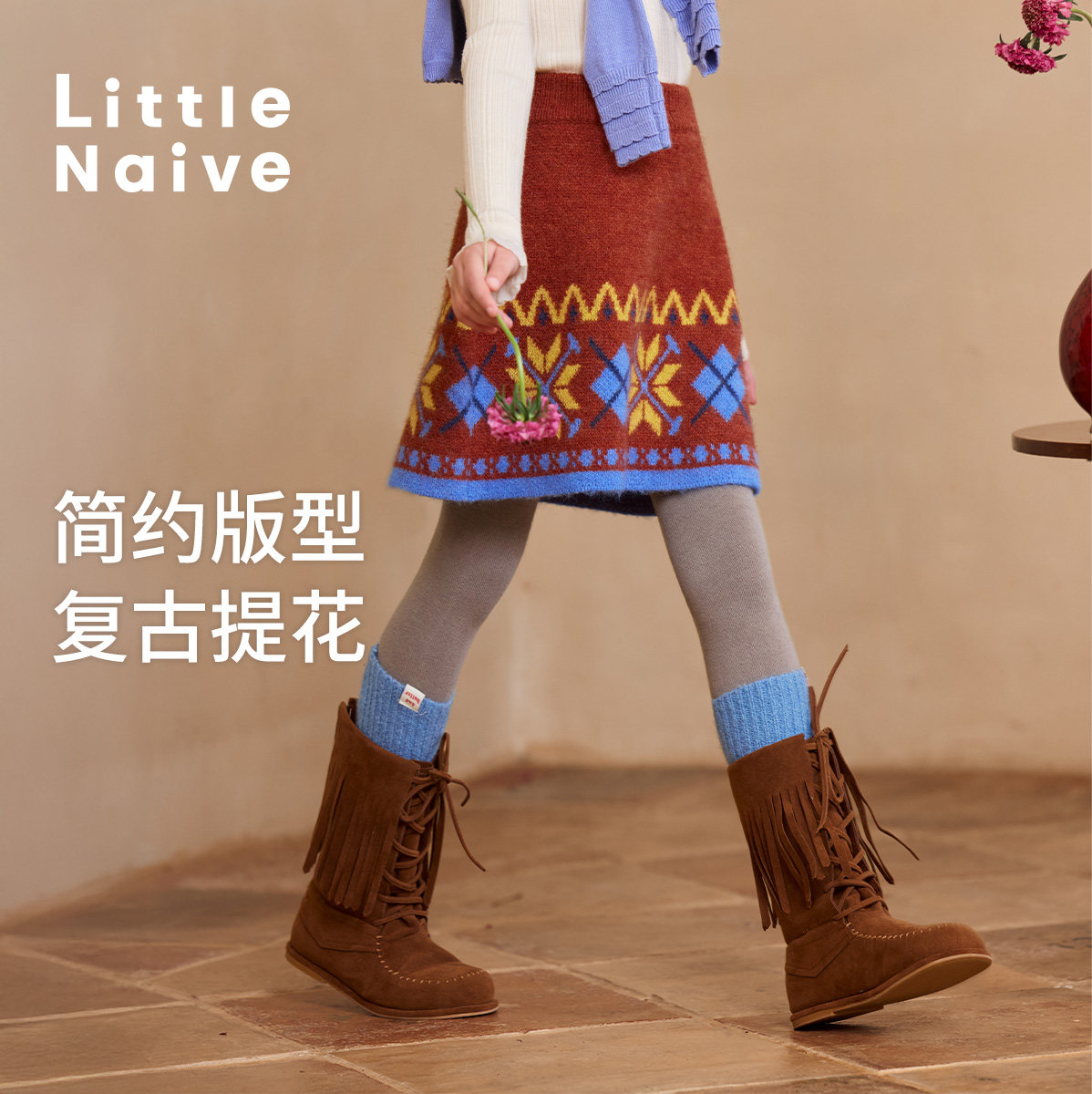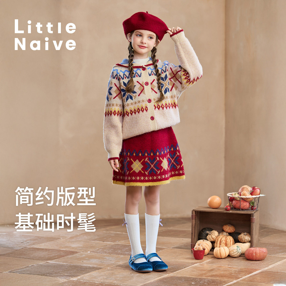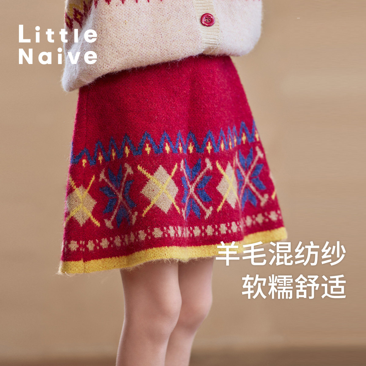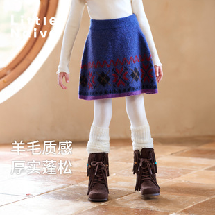 Little 裙子红色圣诞 Naive儿童撞色短裙复古提花半身裙女童冬季