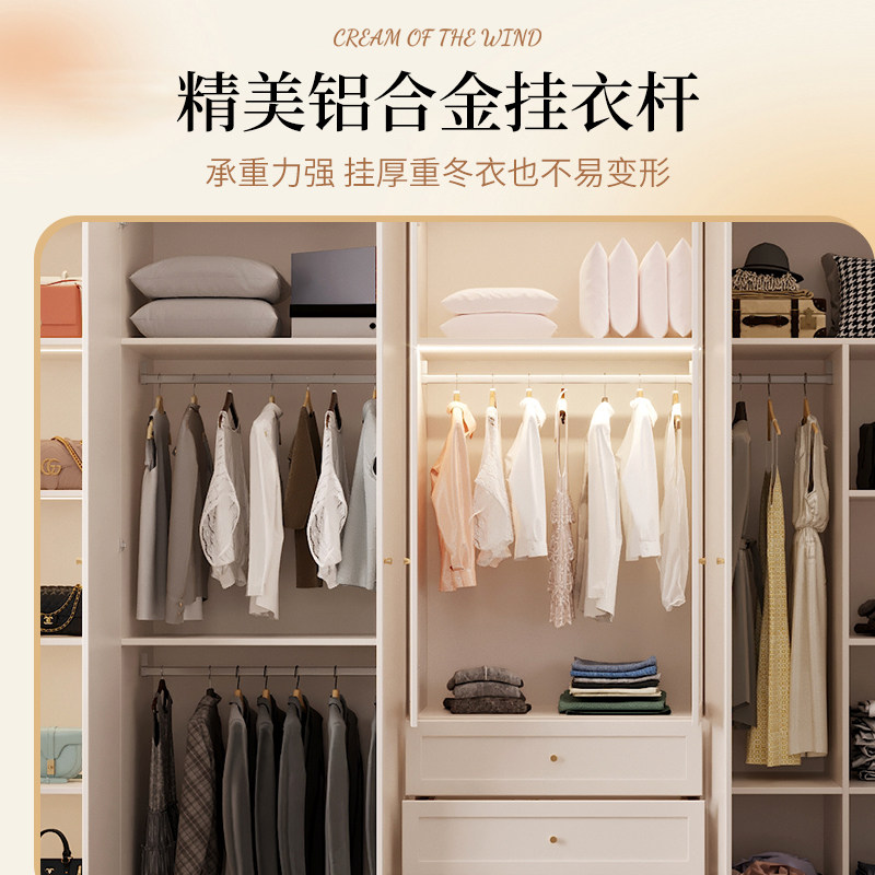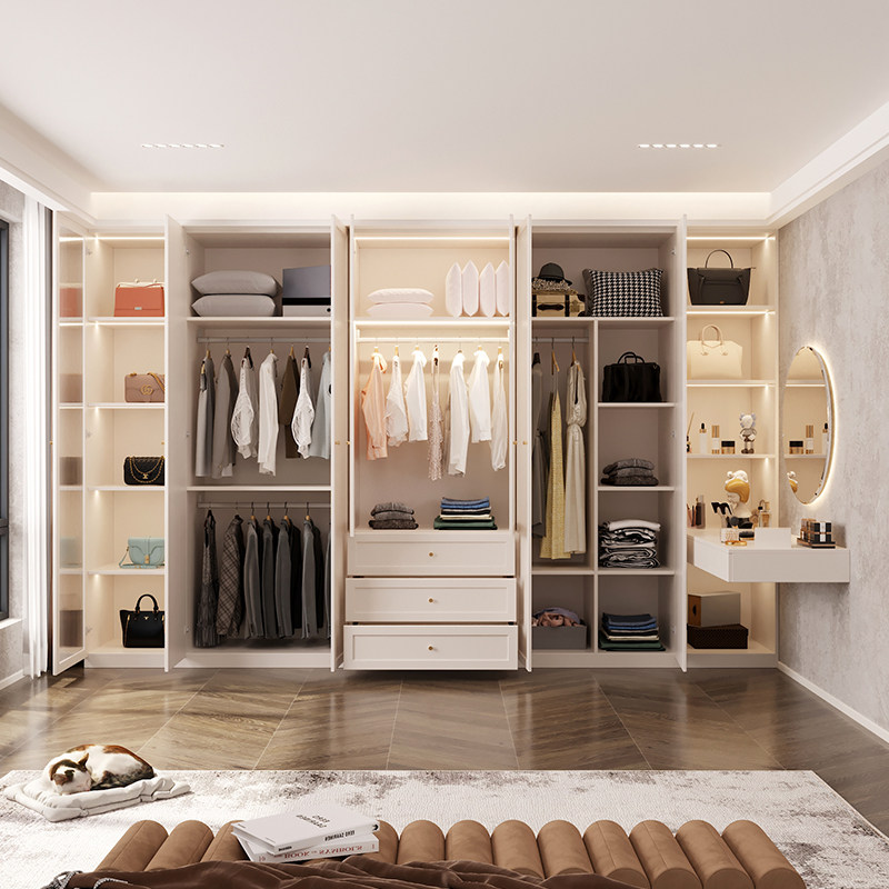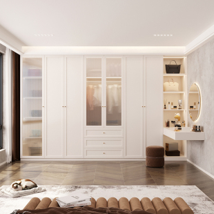 法式 奶油风衣柜家用卧室带梳妆台转角书桌玻璃门衣橱储物柜可定制