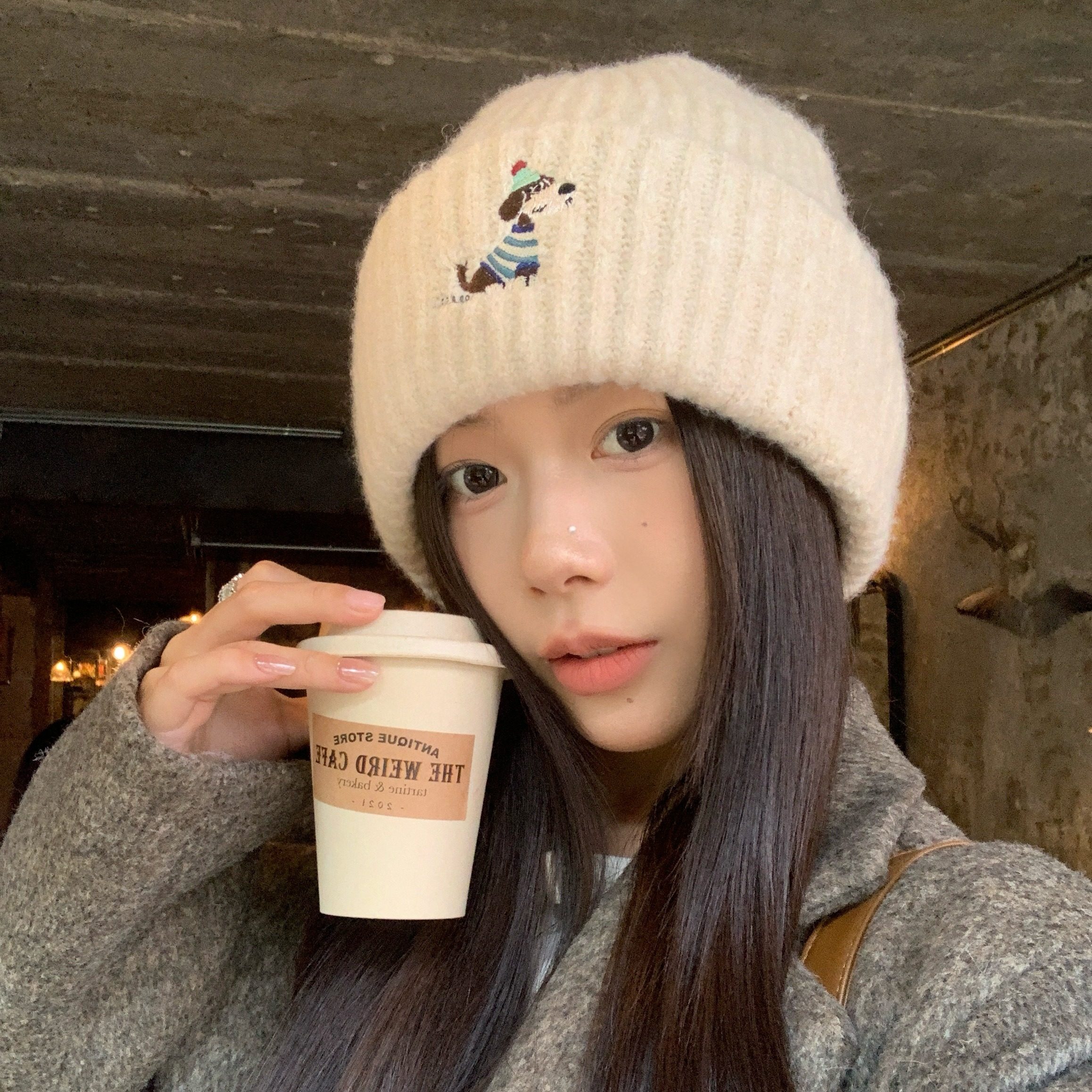 法式 英伦风复古双色双排扣斗篷外套灰色针织打底衣中长裙三件套女