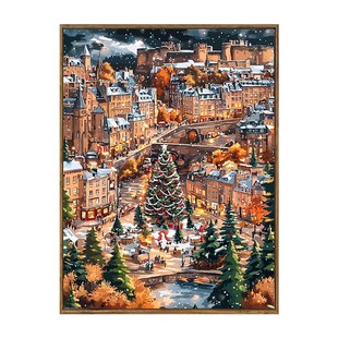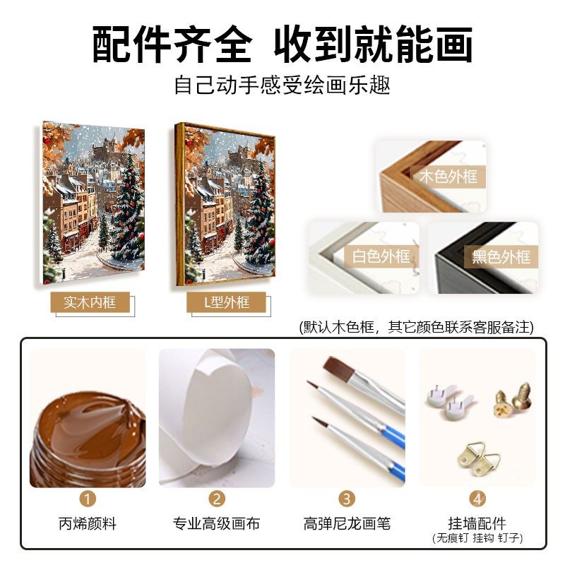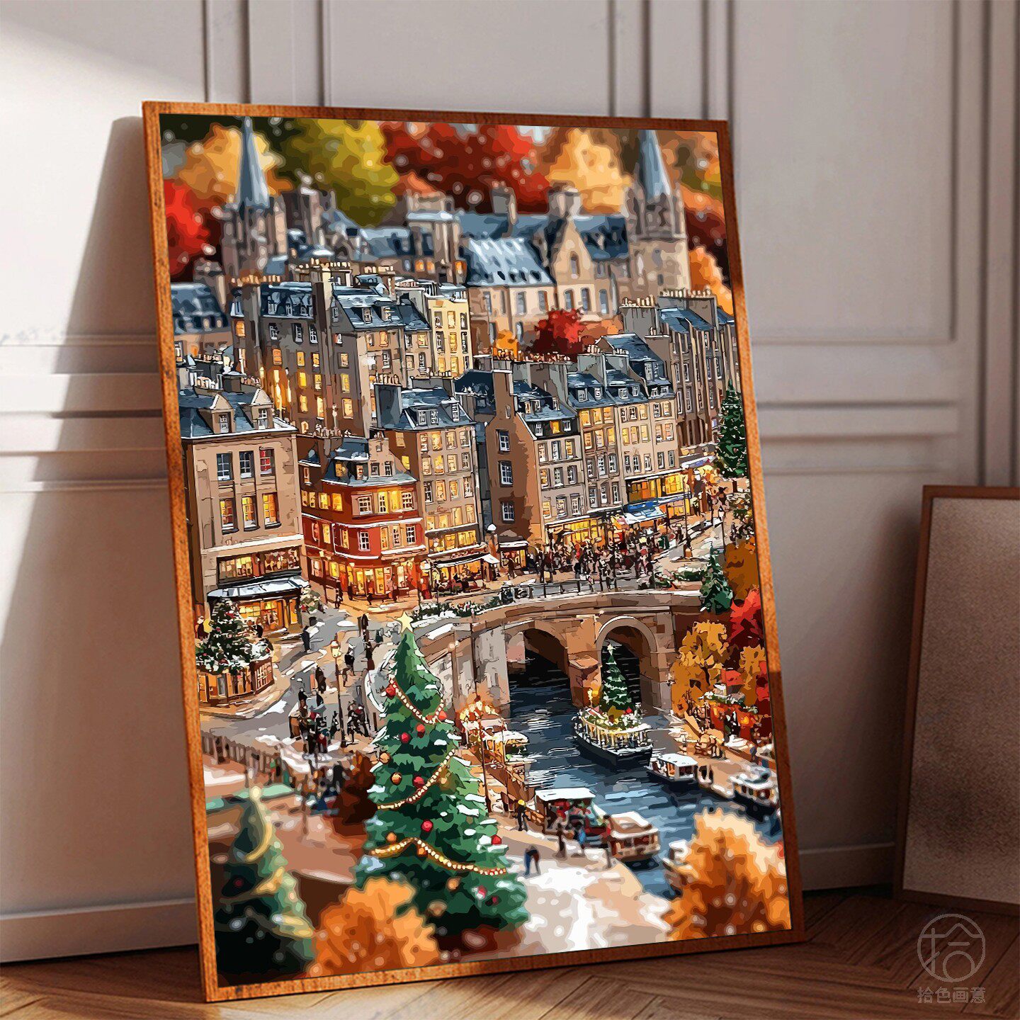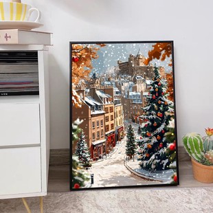 冬灯圣诞节小镇数字油画diy填充涂色手工手绘圣诞树丙烯装 饰挂画