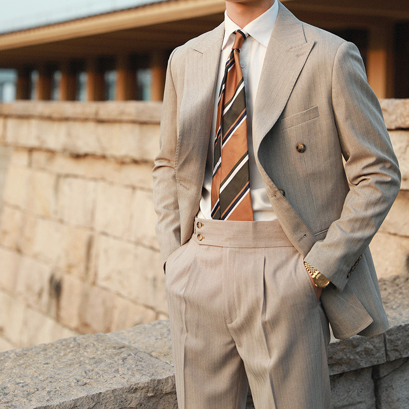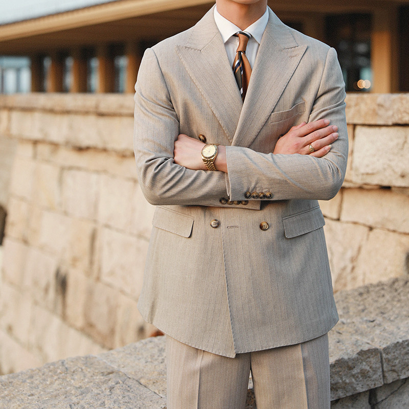 休闲条纹西装 男春夏戗驳领商务免烫单西双排扣垂感百搭双开衩外套