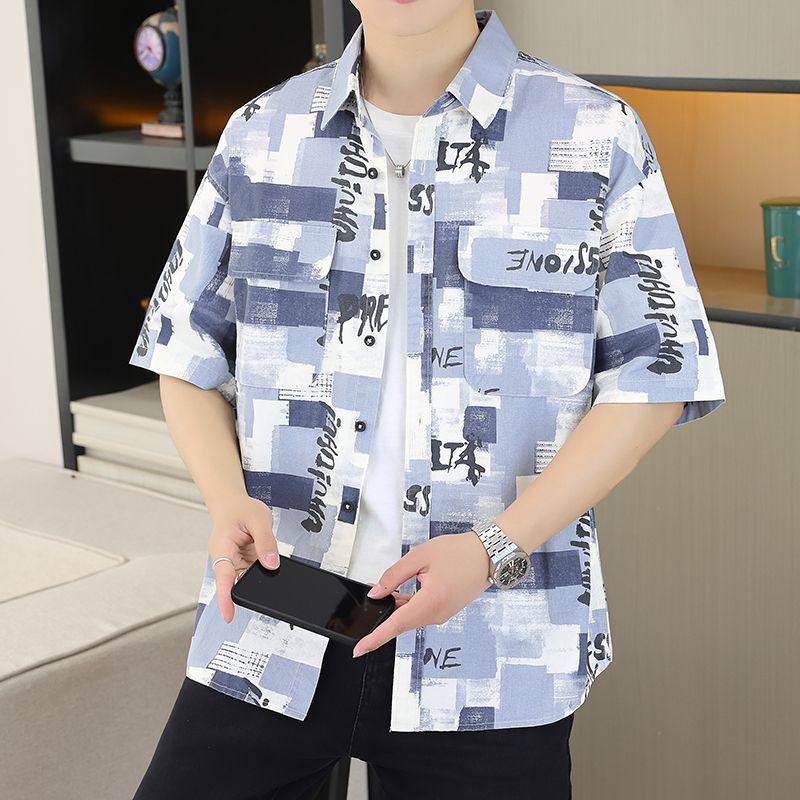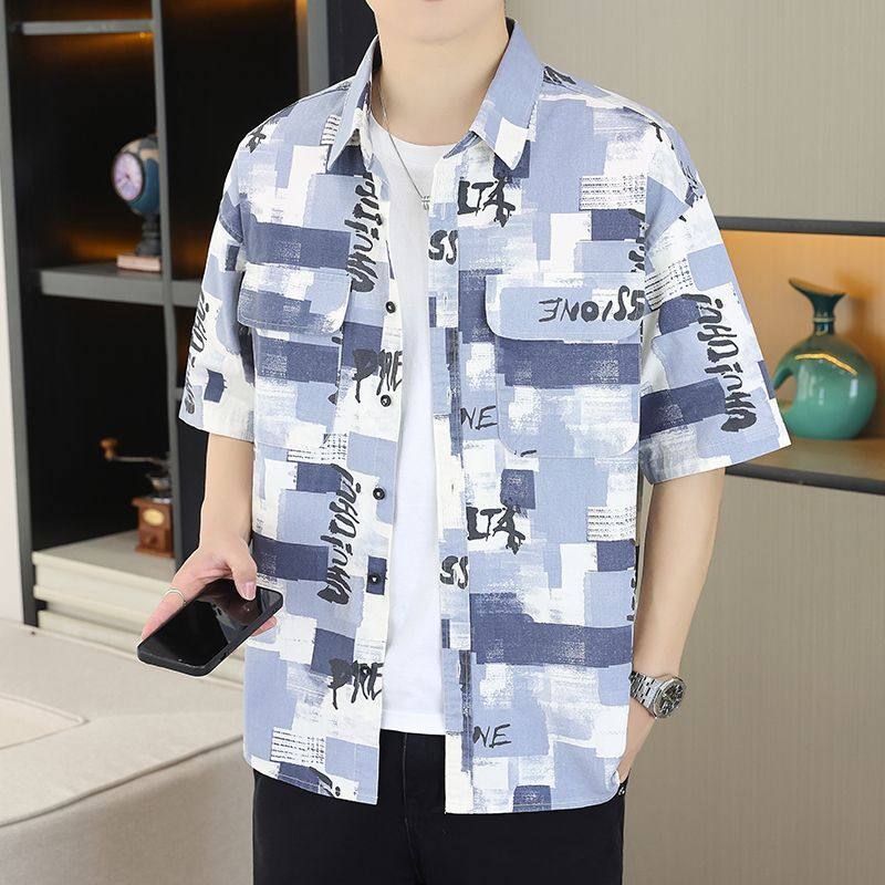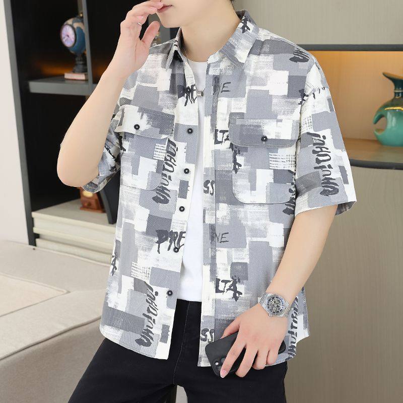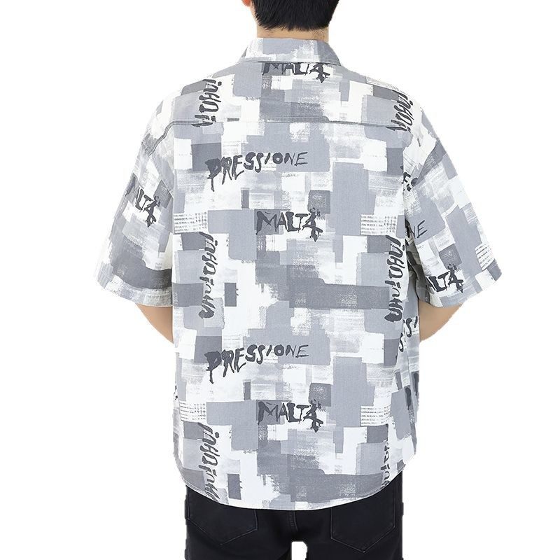 夏季 韩版 男士 衬衫 宽松印花青少年帅气衬衣外套 潮流短袖 2025新款
