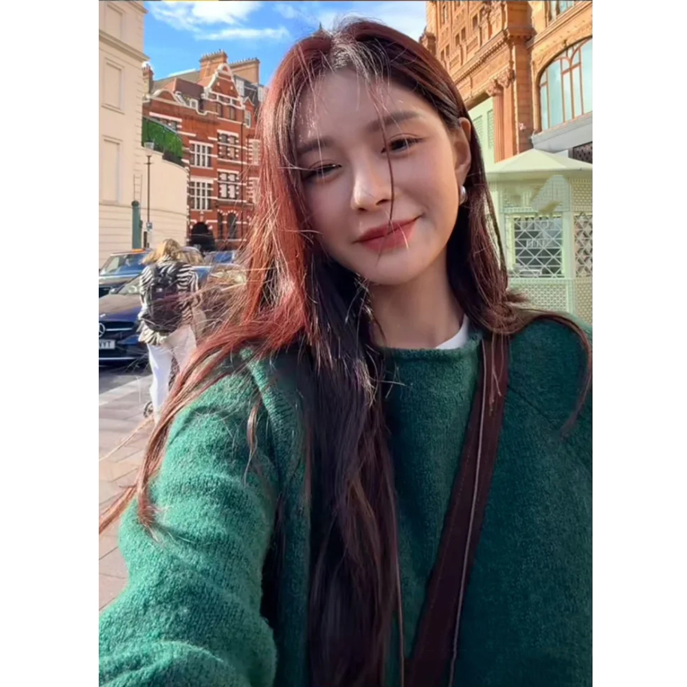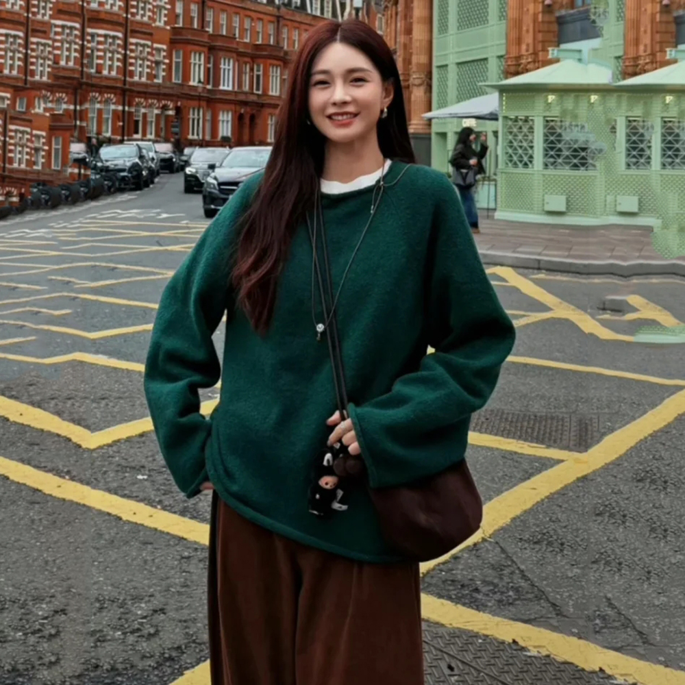 欧洲沈梦辰同款 宽松慵懒风休闲针织 绿色圆领大廓型毛衣女2025新款