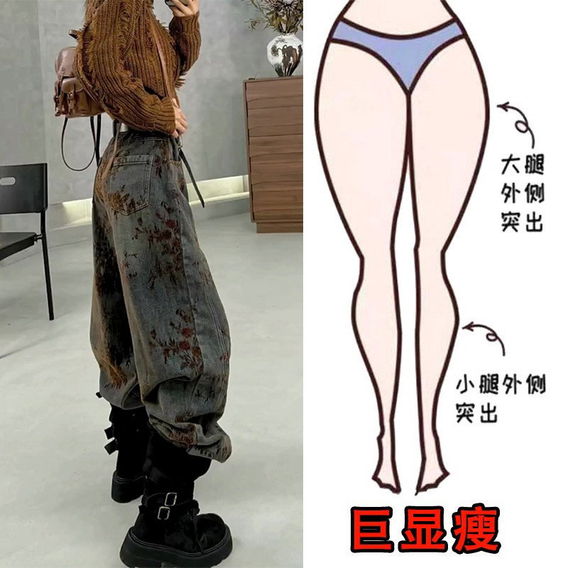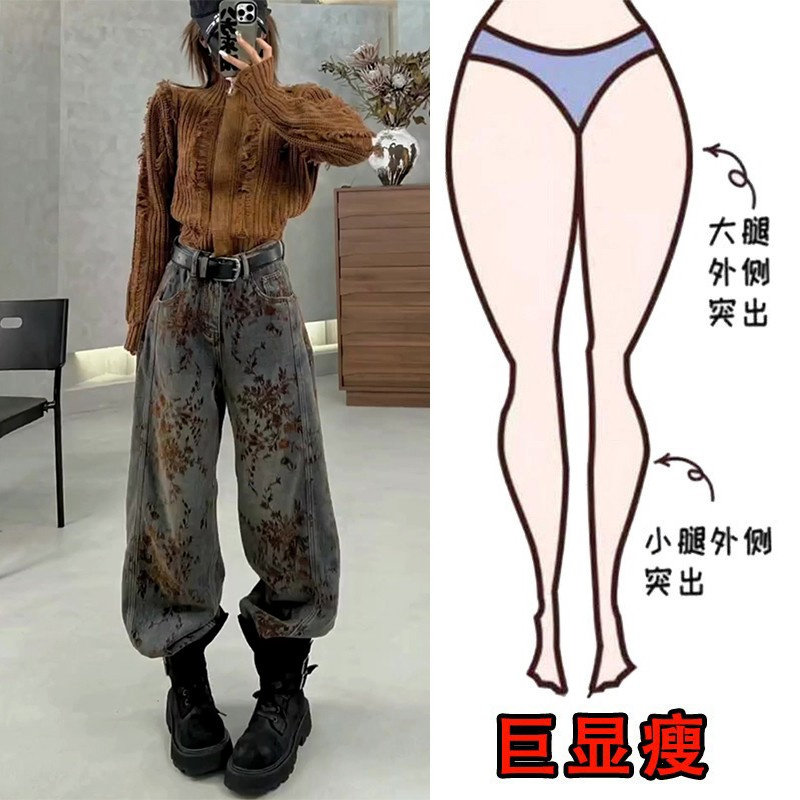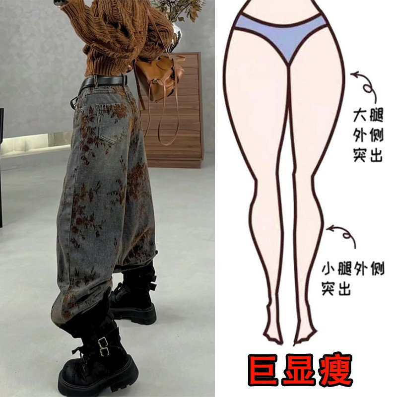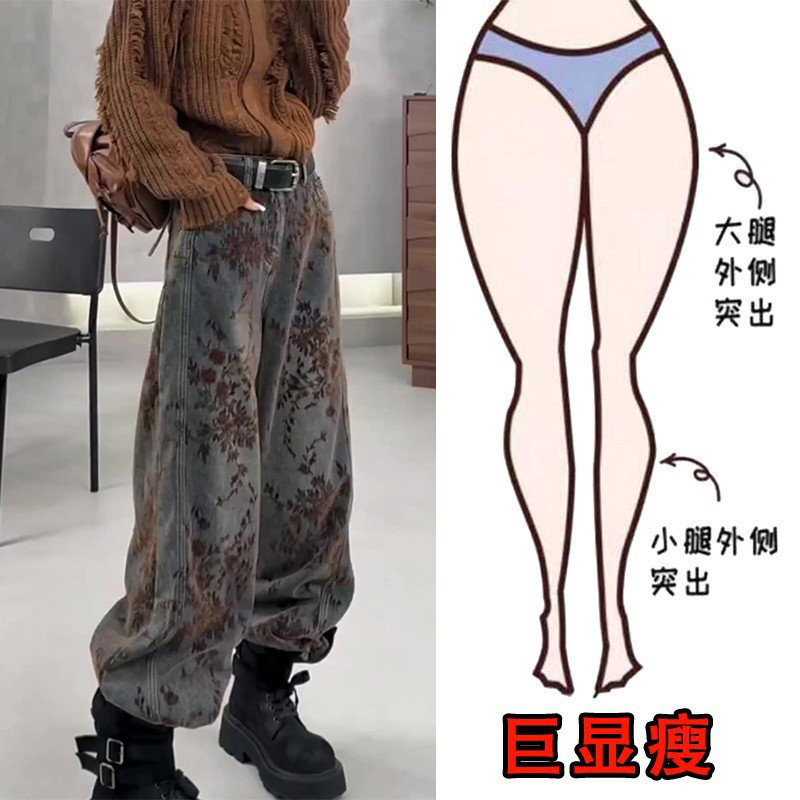 显瘦高腰阔腿裤 女梨形身材大码 植绒复古提花设计直筒牛仔裤 冬季