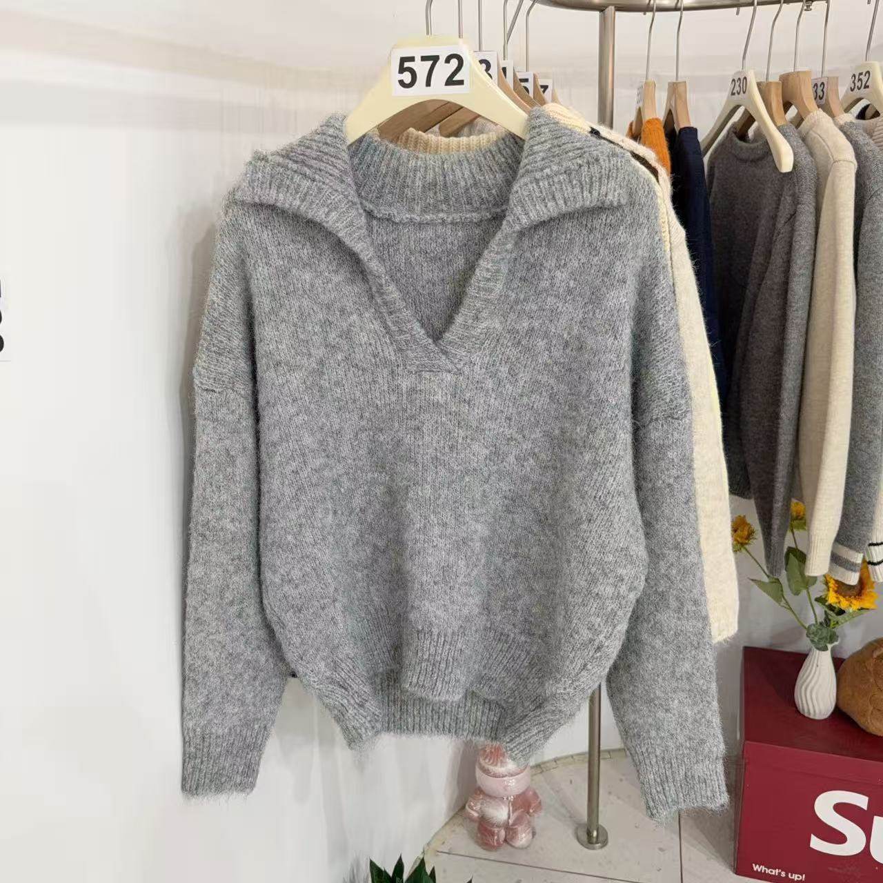 翻领慵懒风加厚上衣冬装 灰色V领软糯针织毛衣女早秋季 2025新款
