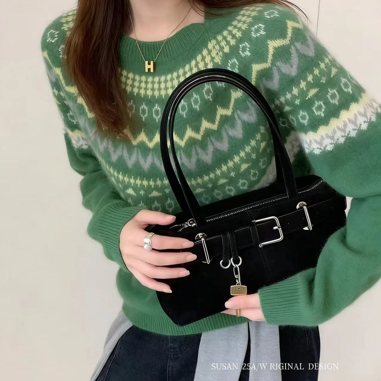 YZ100羊毛绿色费尔岛提花针织毛衣女2025年秋冬款 复古撞色羊毛衫