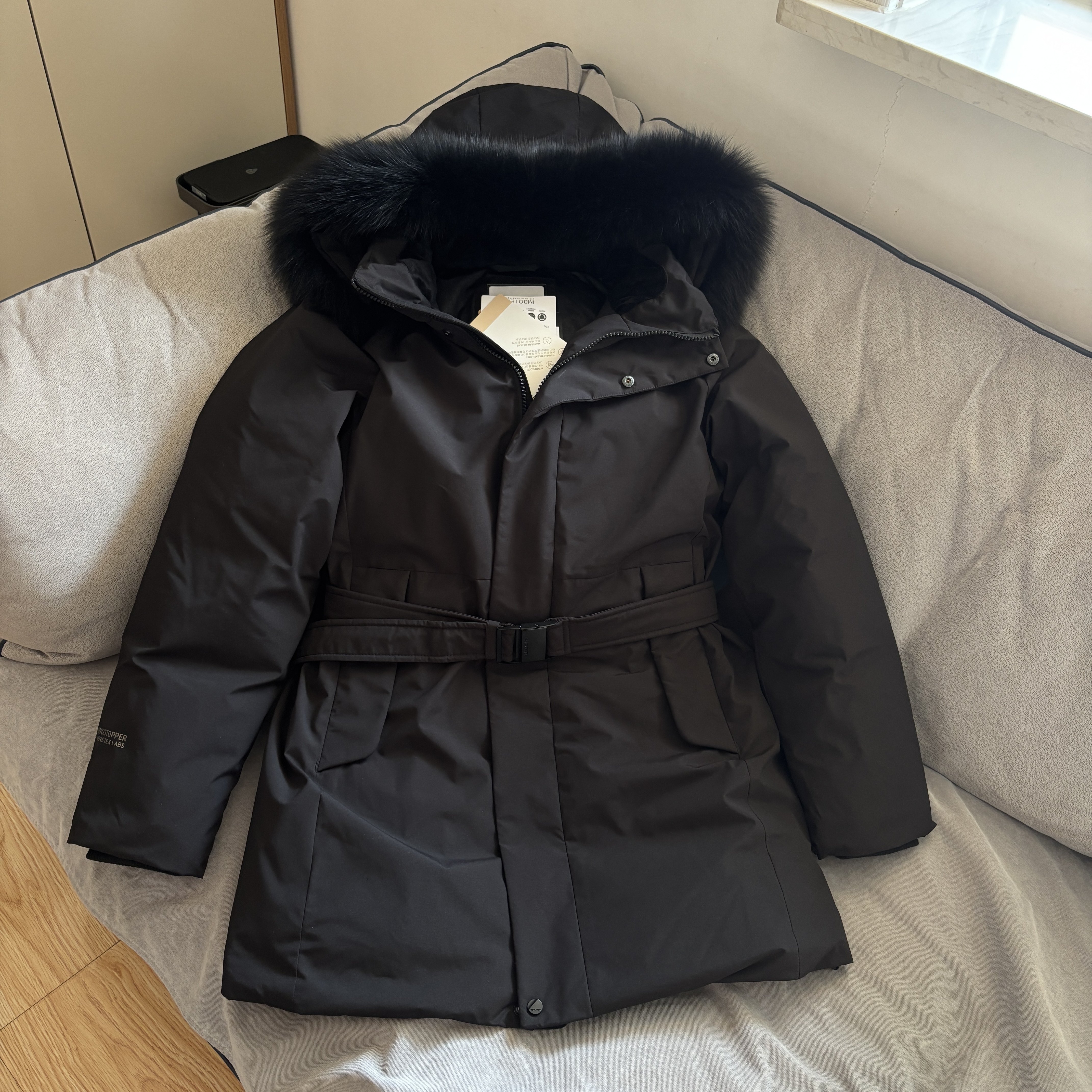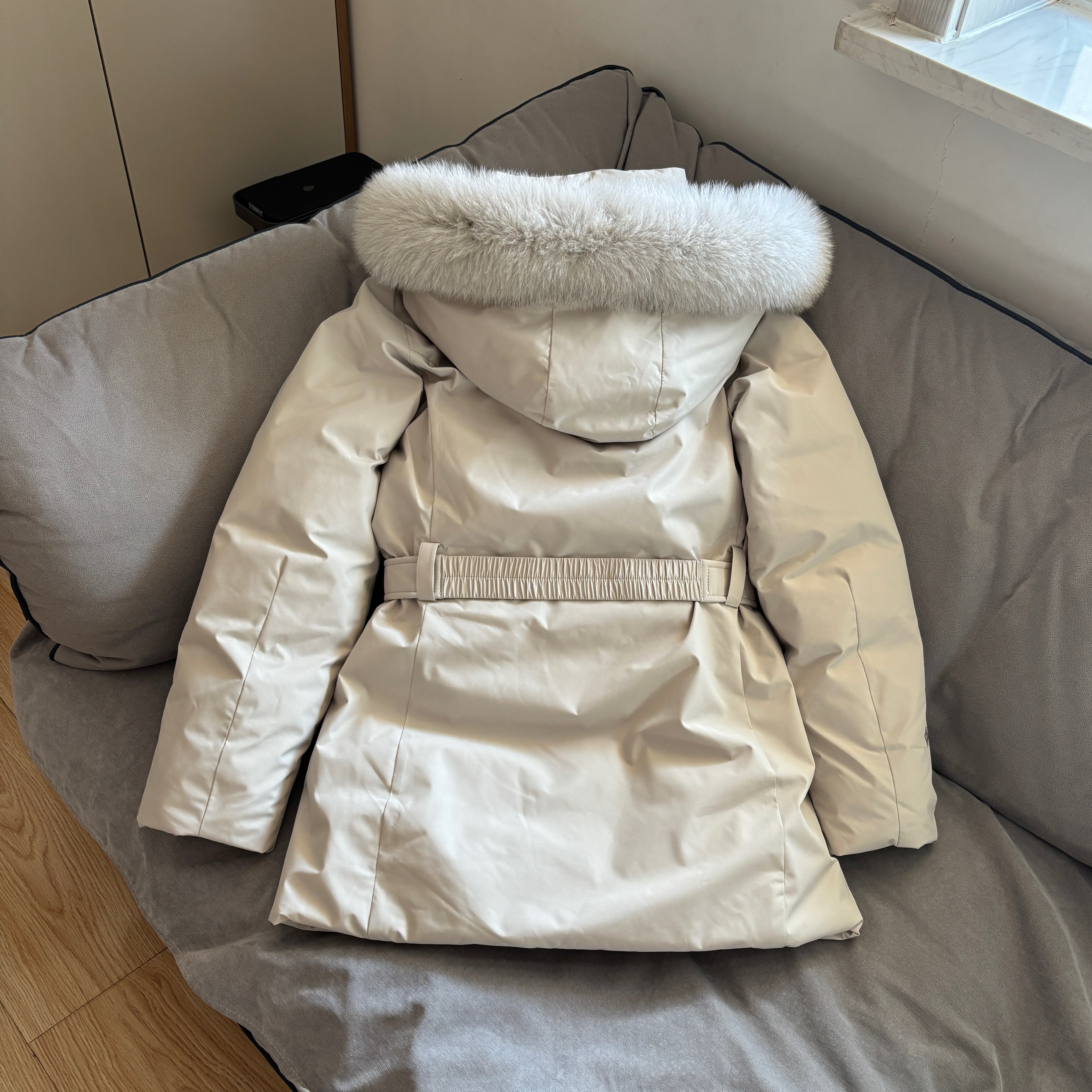 韩国韩版 鹅绒羽绒服女腰带收腰显瘦加厚连帽外套冬 狐狸毛领中长款
