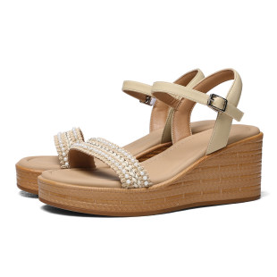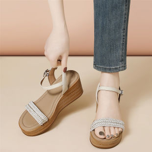 外穿一字带坡跟编织凉鞋 香港水钻防水台厚底草编鞋 女2026春夏新款