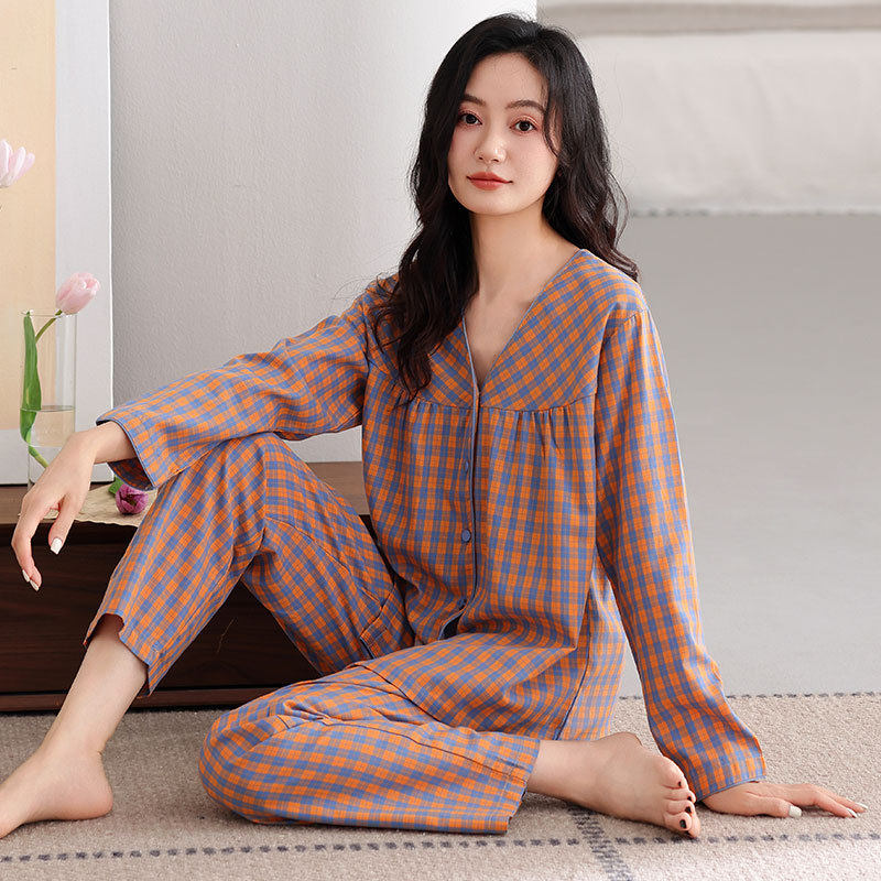 秋季 2025新款 全棉中年妈妈家居服 梭织纯棉长袖 带胸垫睡衣女春秋款
