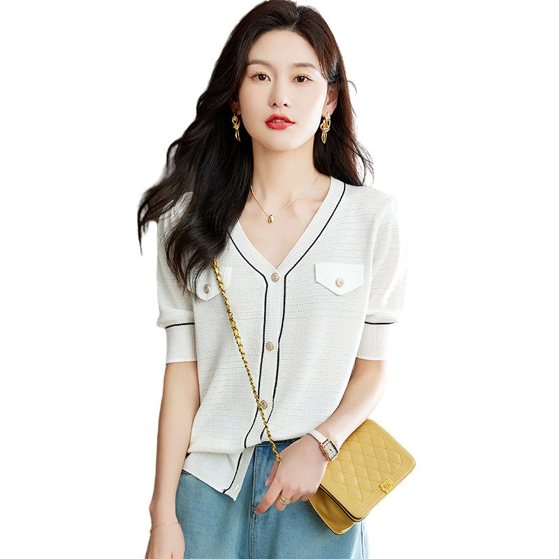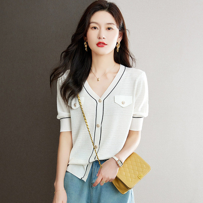 V领短袖 短款 冰丝针织开衫 外搭修身 外套防晒百搭小披肩 女薄款 夏季