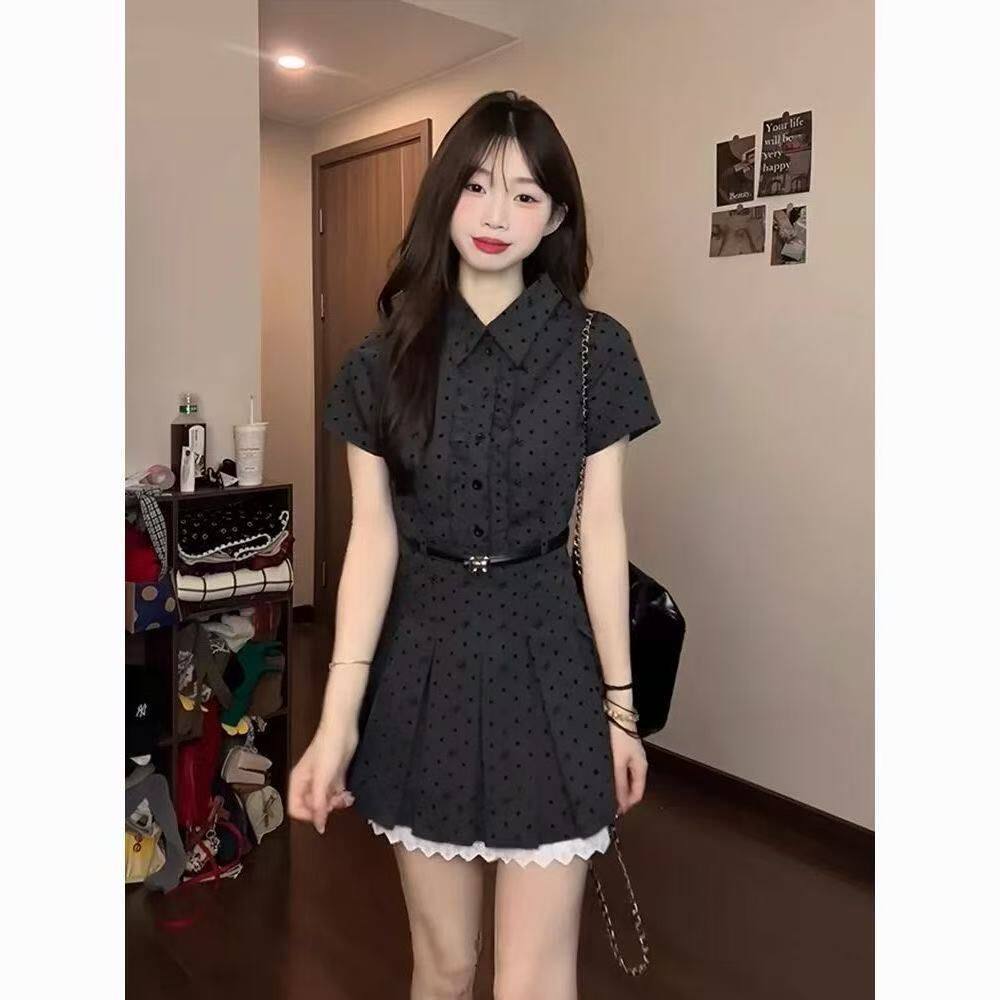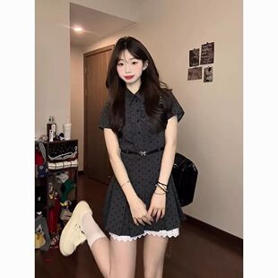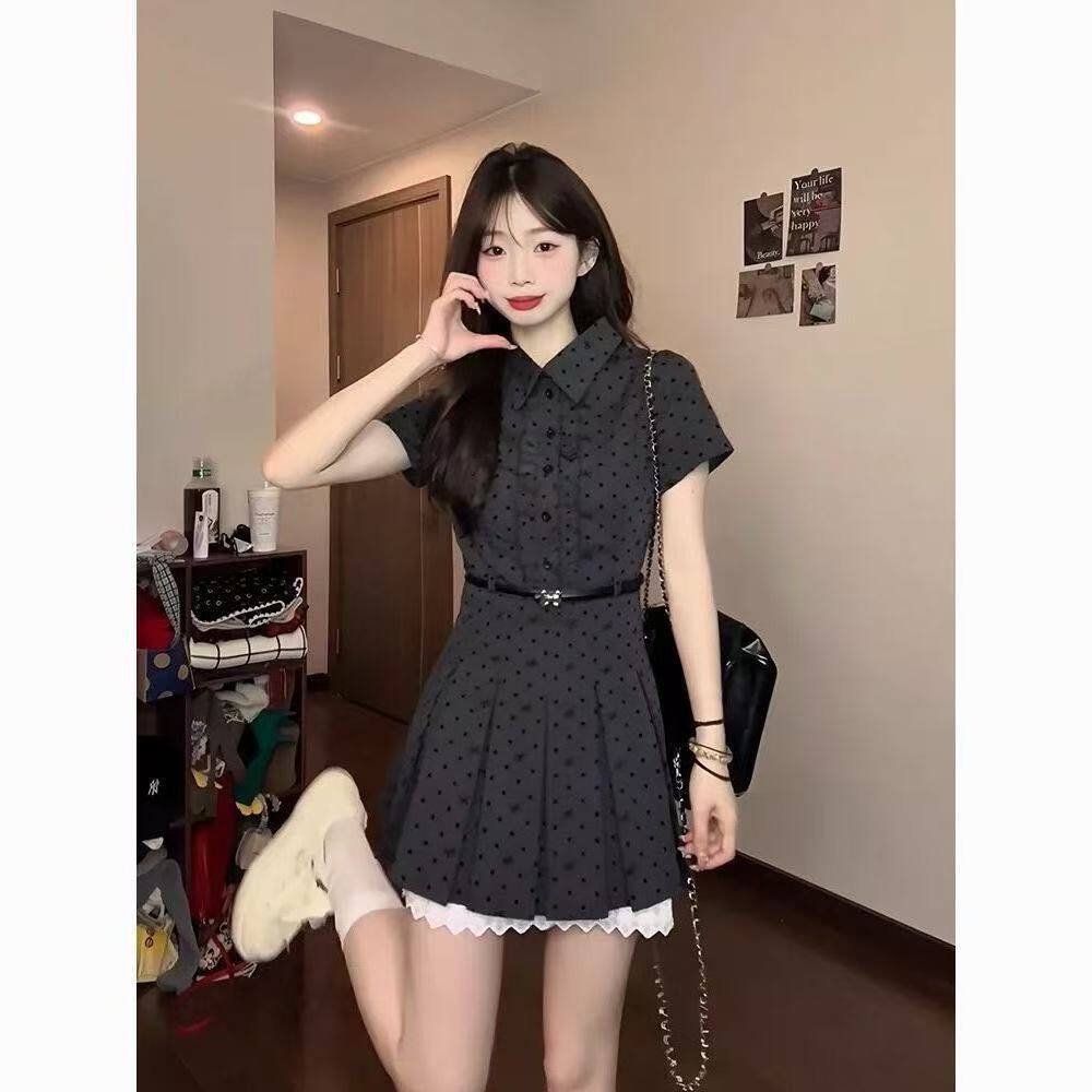 韩系学院风复古假两件波点短袖 连衣裙设计显瘦腰显收腰短裙子潮