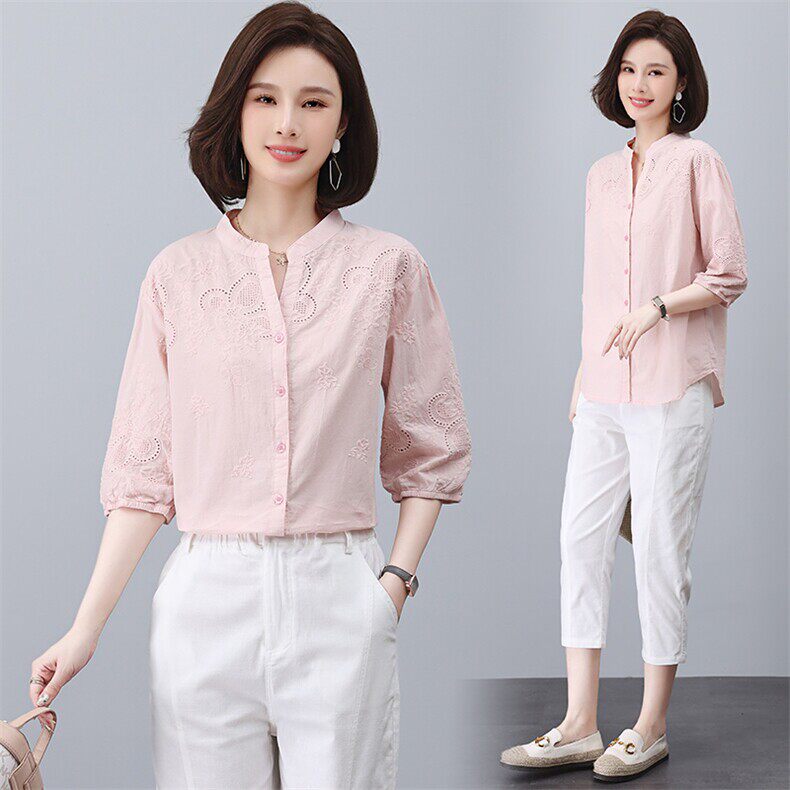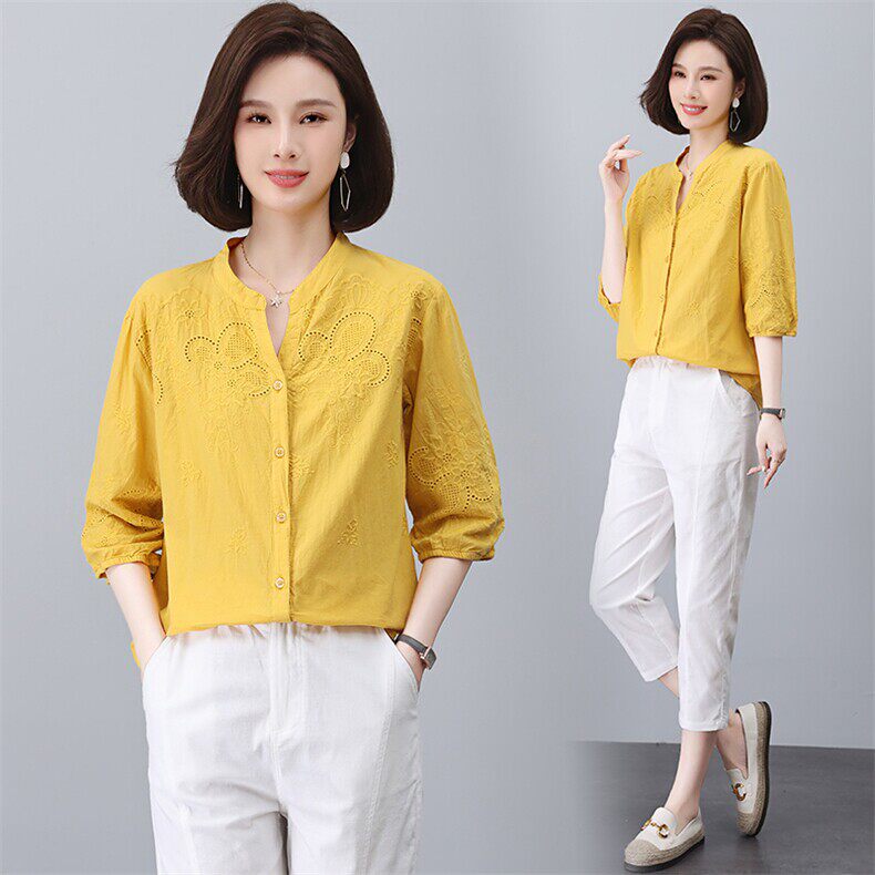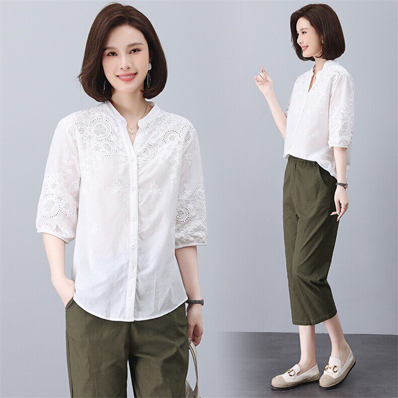 上衣 V领宽松大码 休闲风纯棉刺绣衬衫 女五分袖