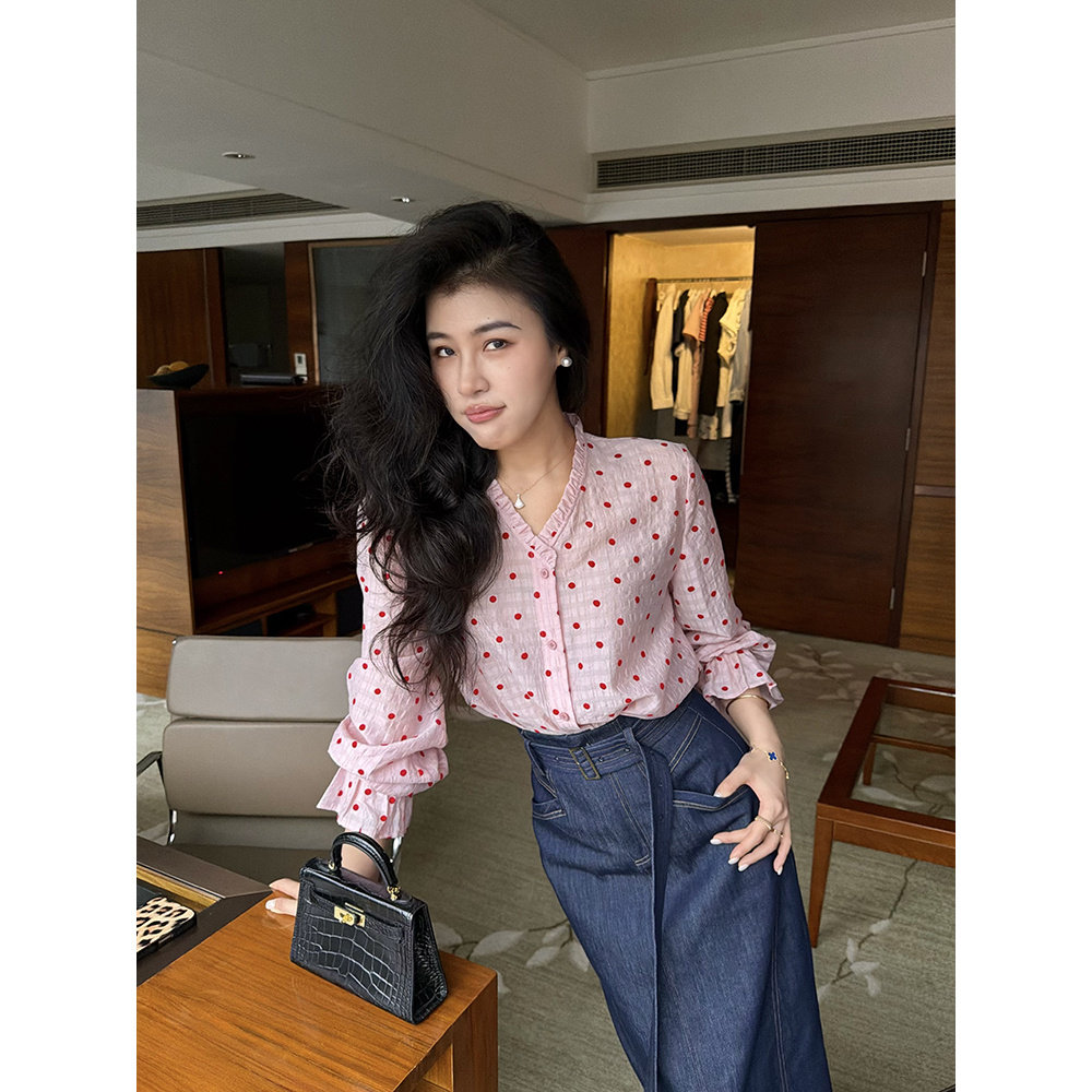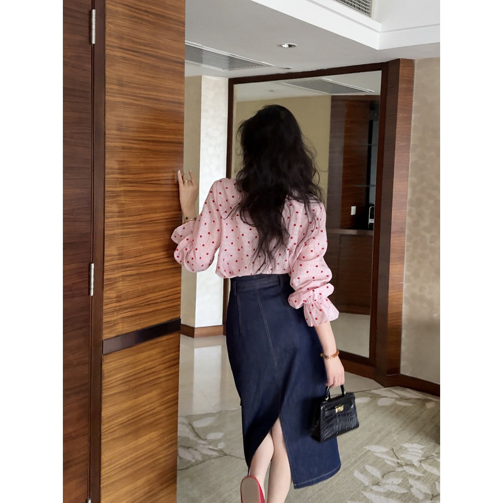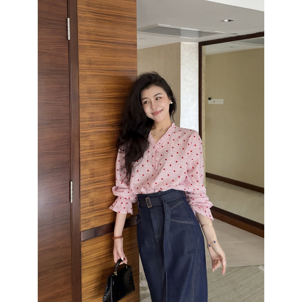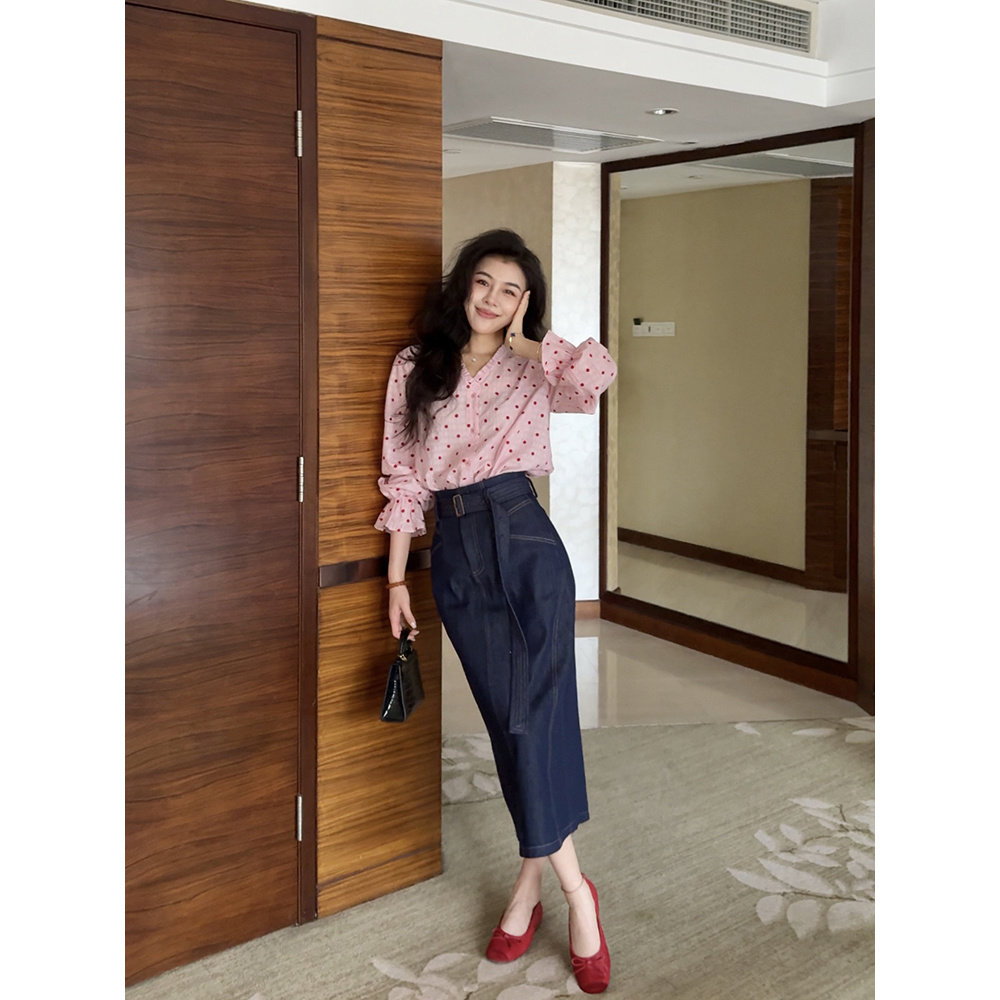 腰带牛仔半裙 红波点复古港风撞色莱赛尔衬衫 张阿星 港风粉黛