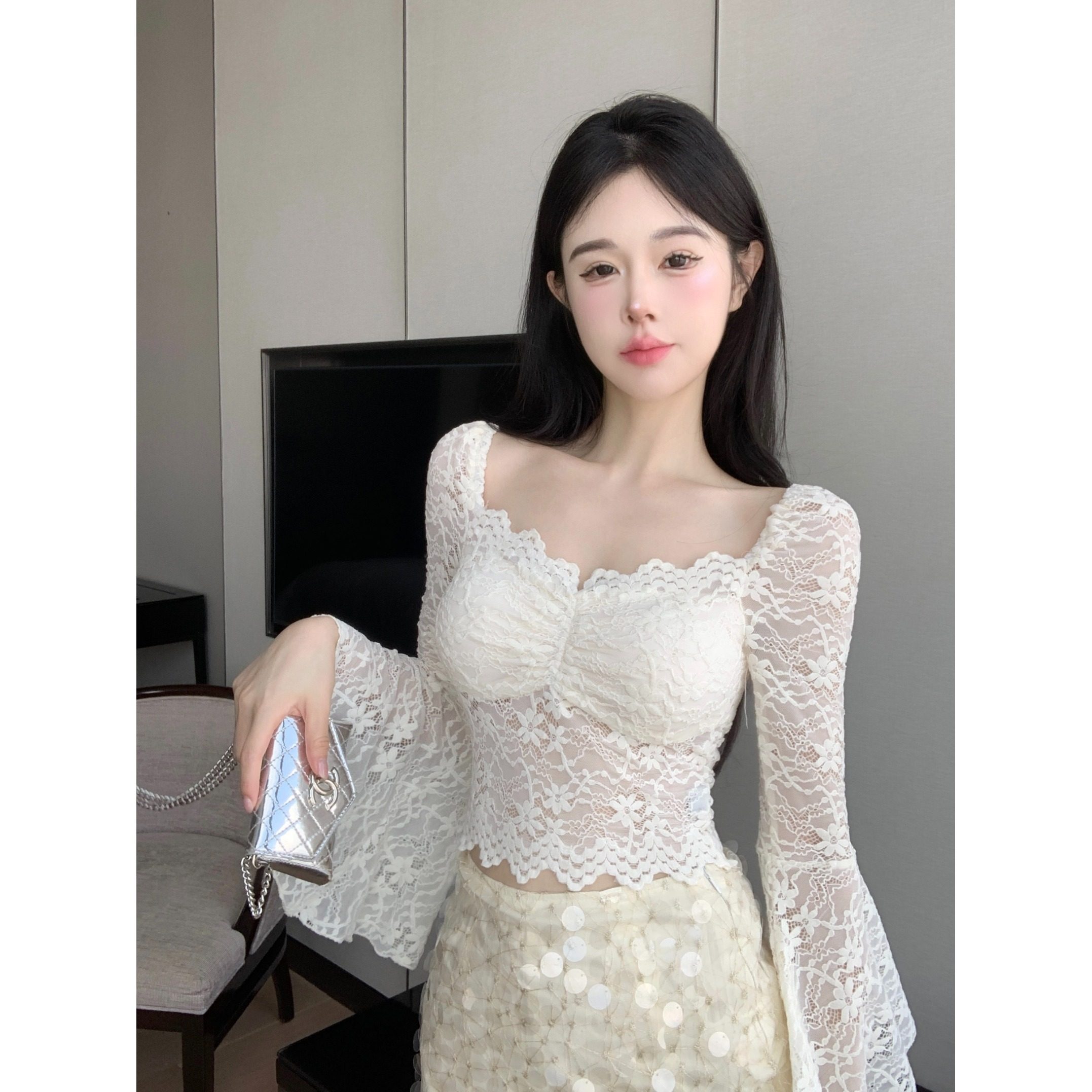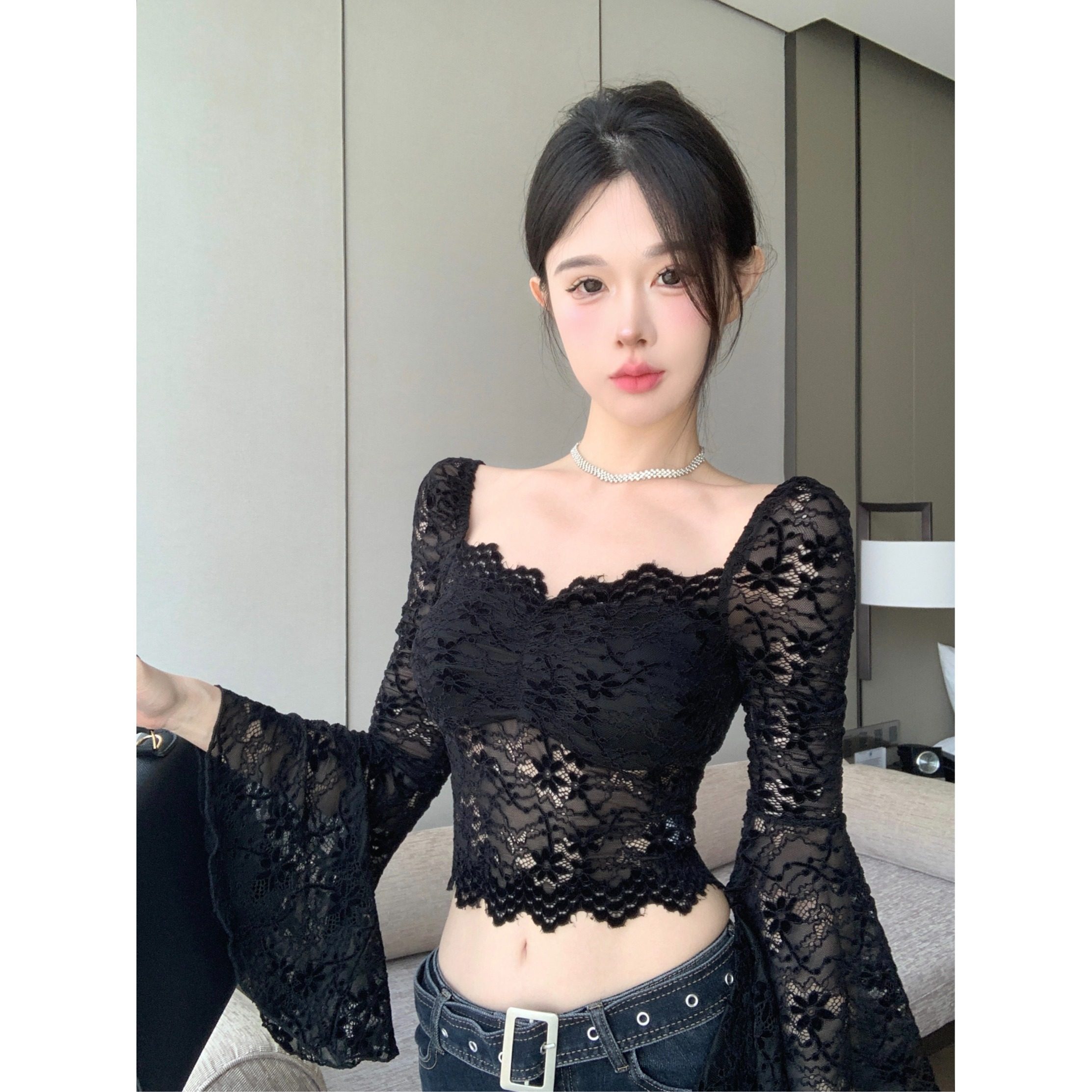 显瘦上衣女成熟 开春修身 蕾丝内搭带胸垫低胸口领喇叭长袖 打底衫