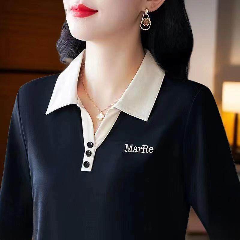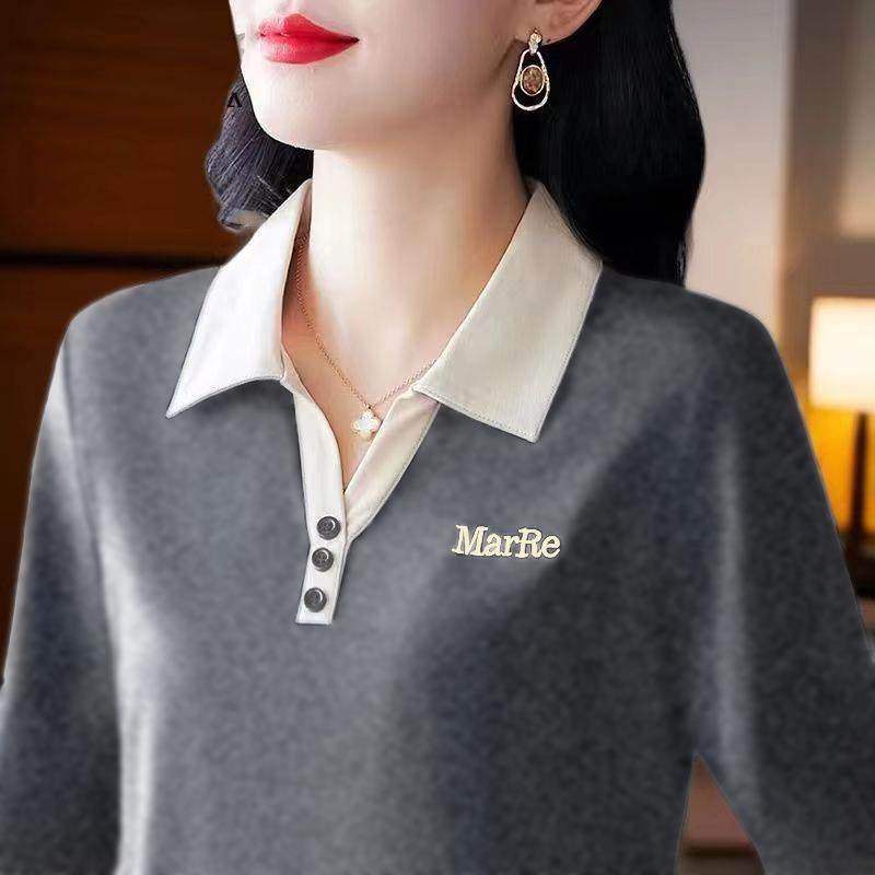 女拼接磨毛打底长袖 显瘦翻领刺绣POLO衫 上衣 假两件修身 FISSXS