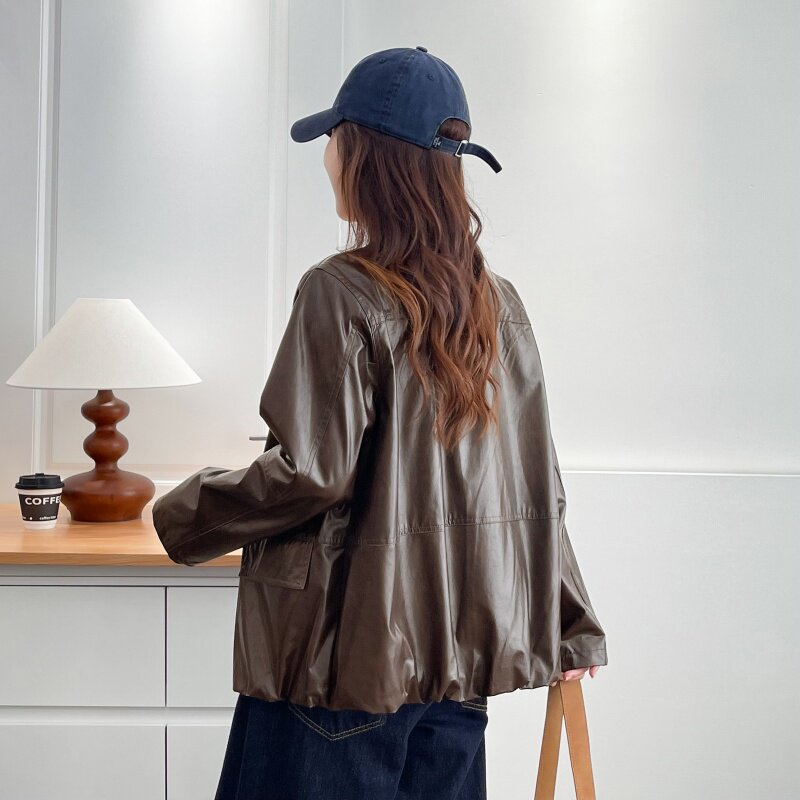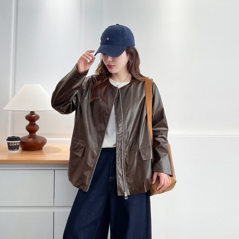 新款 2025秋装 宽松显瘦百搭休闲拉链夹克上衣立领皮衣外套 女装 大码
