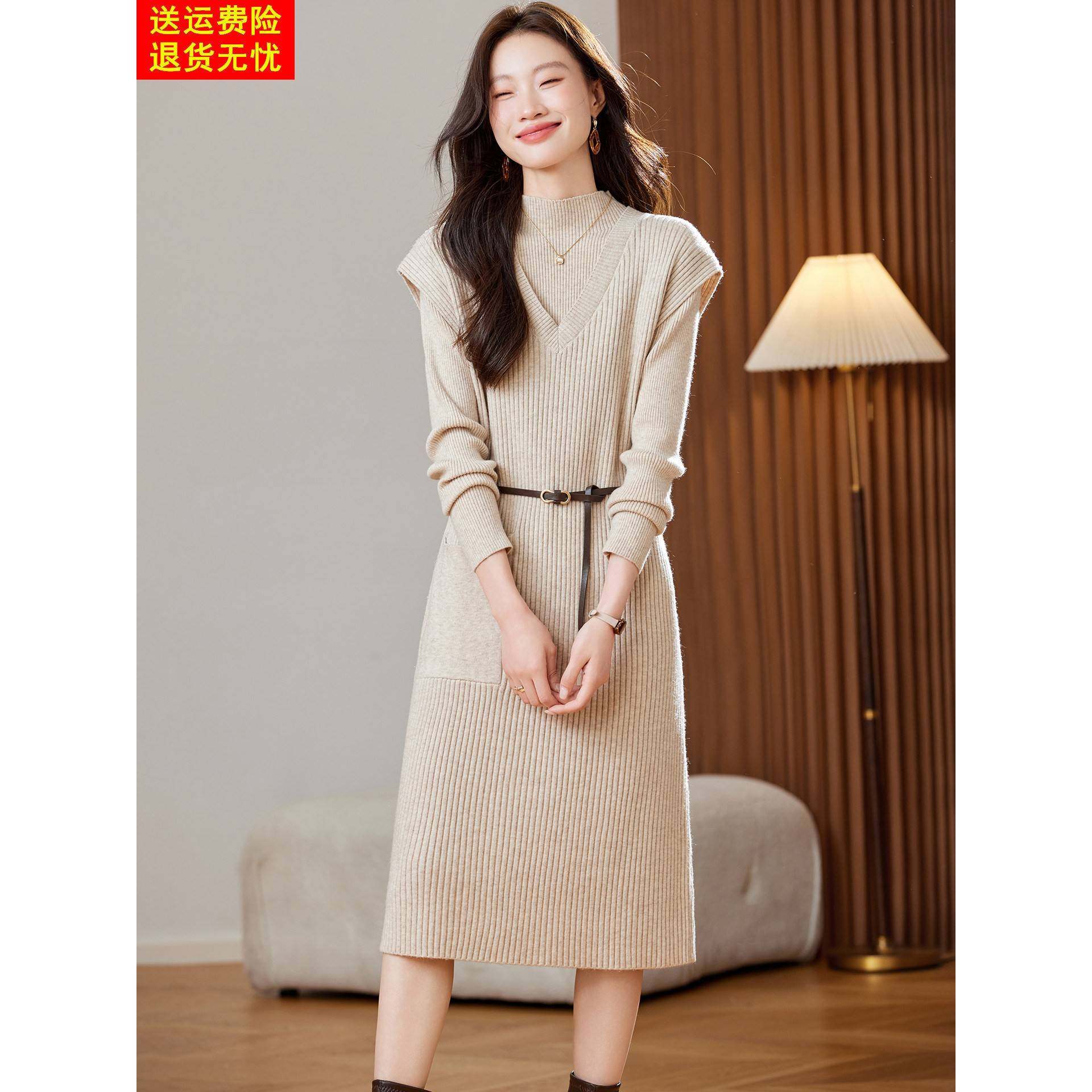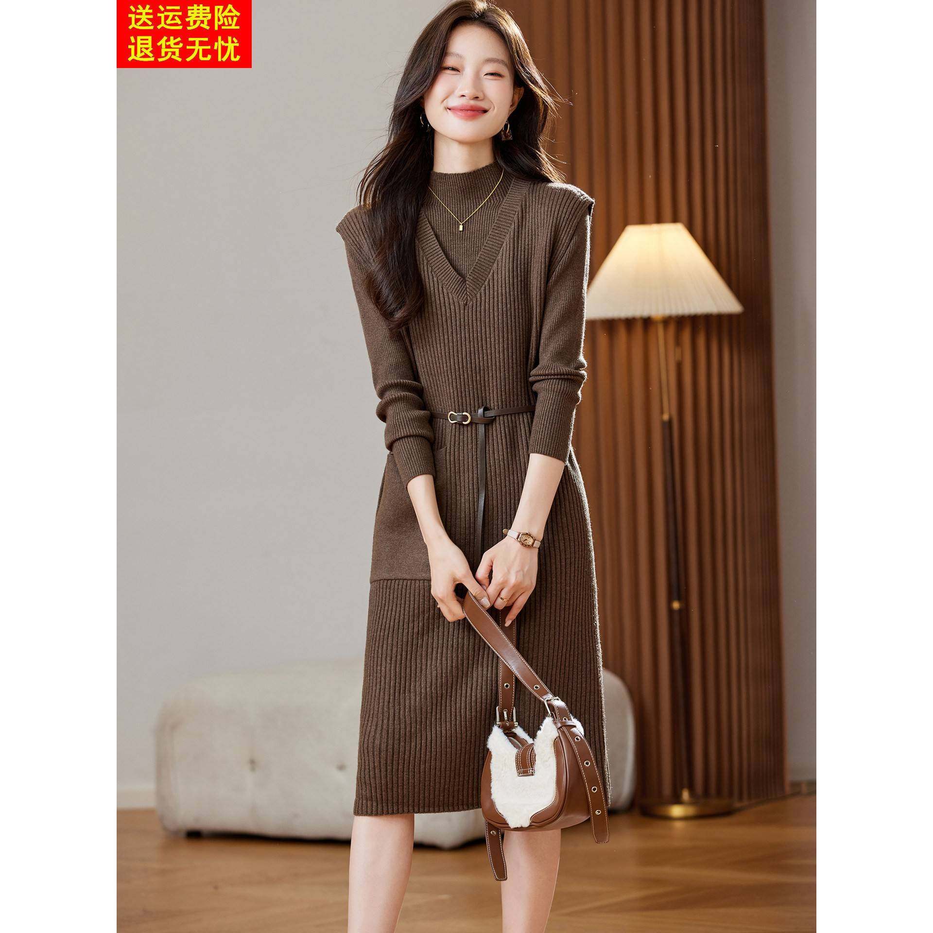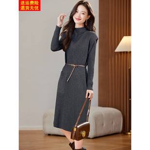 针织连衣裙女秋冬配大衣高级感超好看拉链领中长款 毛衣裙过膝内搭