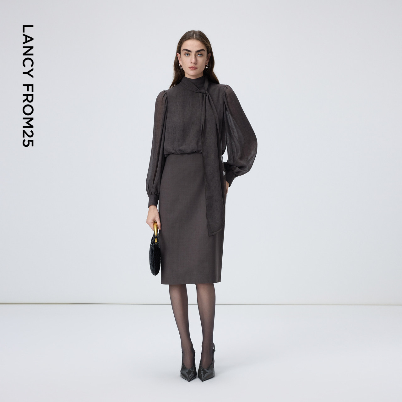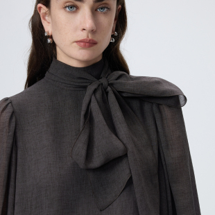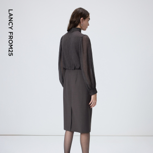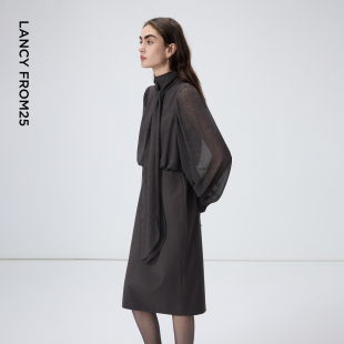 新款 2026年春季 通勤法式 朗姿羊毛拼接飘带领连衣裙设计感气质时尚