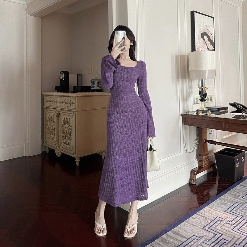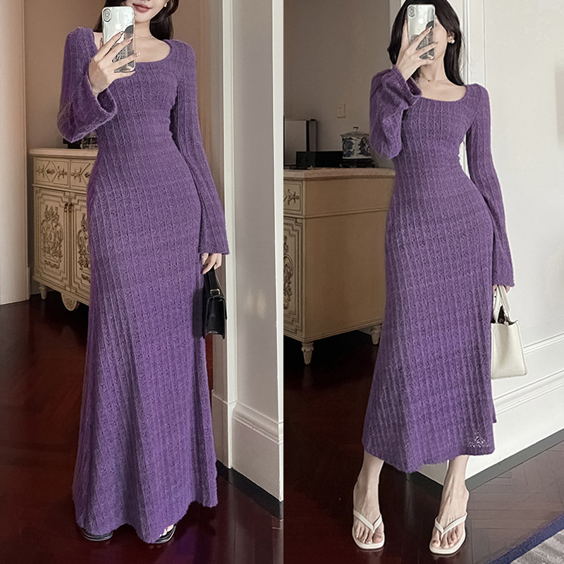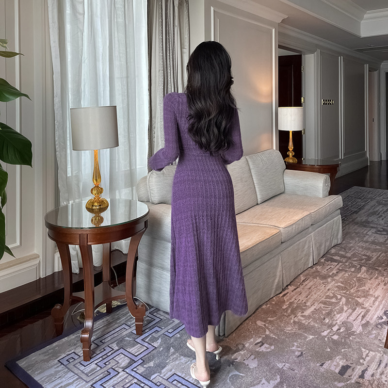 罩衫 裙长袖 吊带紫色长裙 性感蕾丝针织连衣裙女秋冬套装 GirlsAt18
