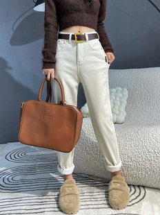 女高腰显瘦小脚休闲哈伦萝卜裤 米杏色加绒加厚牛仔裤 新款 欧货冬季