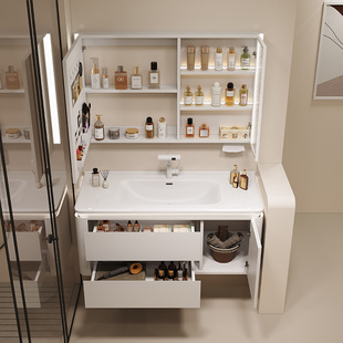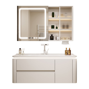 简约奶油风陶瓷一体智能浴室柜镜柜组合卫生间收纳洗漱台洗脸盆
